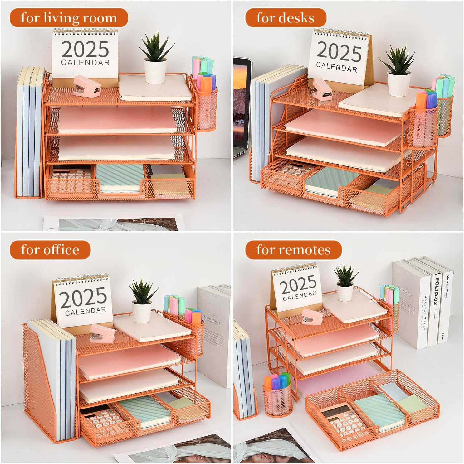 gianotter Paper Letter Tray Organizer with File Holder, 4-Tier Desk Accessories & Workspace Desk Organizers with Drawer and 2 Pen Holder for Office Supplies (Orange)