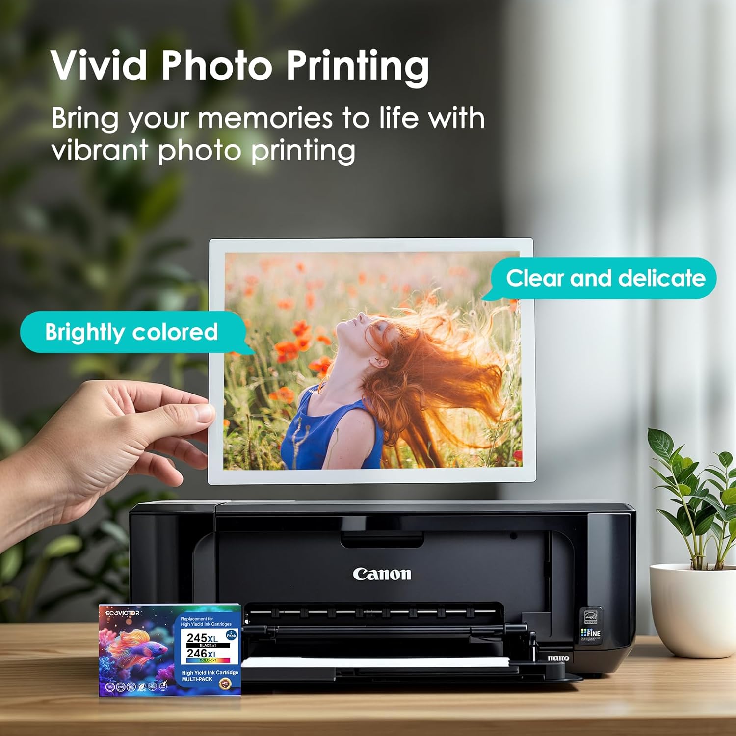 - Eco-Friendly Printing Excellence: Eco Victor 245xl 246xl ink cartridges for canon printers are made from eco-friendly materials and the latest technology to deliver greater efficiency, higher printing precision, and reliable accuracy. Certified Climate Pledge Friendly and meeting FSC standards, these cartridges support sustainability. The 245xl black ink cartridge prints sharp, clear black text for your documents, and the 246xl color ink cartridge produces vibrant, natural color photos.
