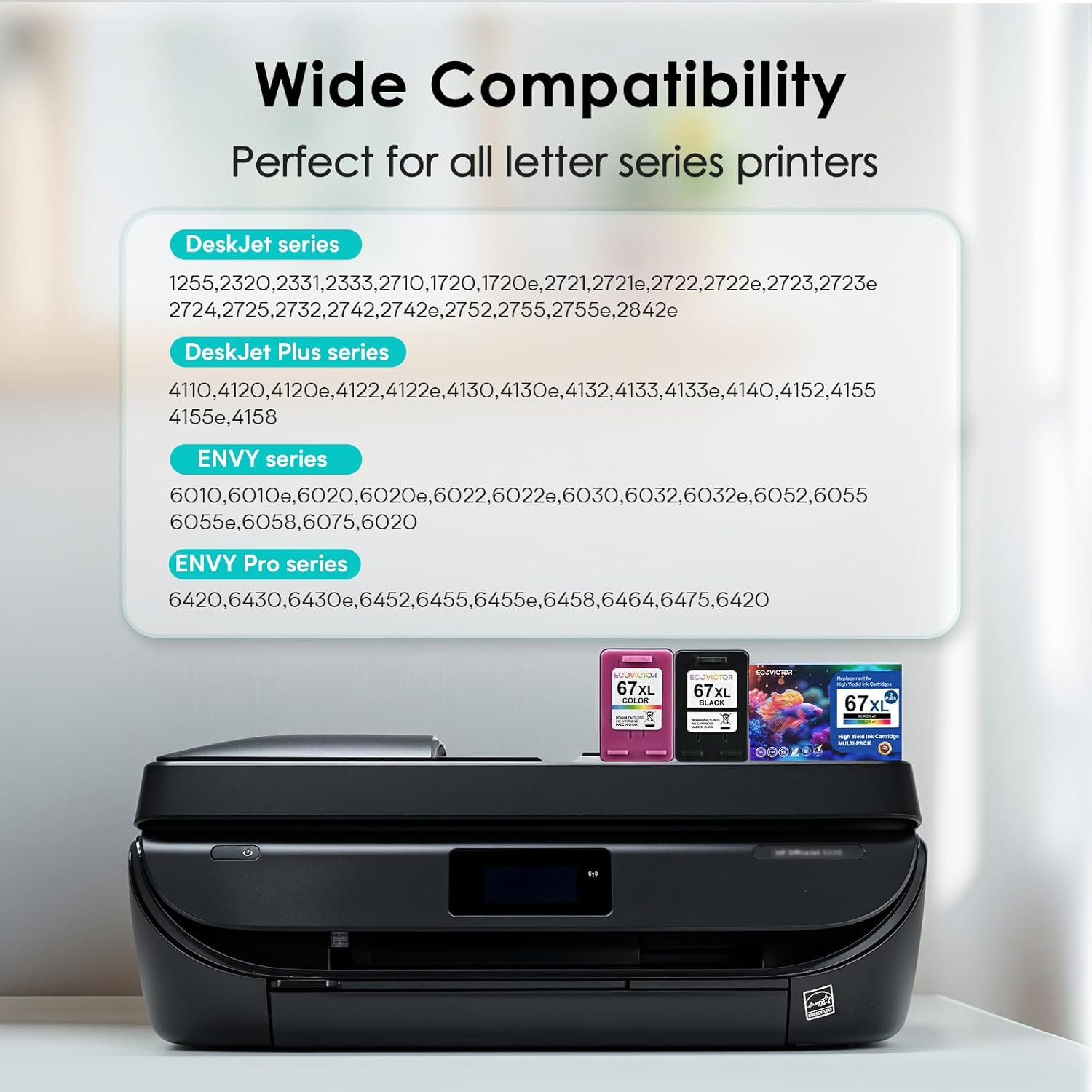 - Wide Compatibility: Ink 67xl black and color combo pack Compatible for (1)HP ENVY 6010 6010e 6020 6020e 6022 6022e 6030 6032 6032e 6052 6055 6055e 6058 6075 Printer; (2)HP ENVY Pro 6420 6400 6430 6430e 6452 6455 6455e 6458 6464 6475 Printer; (3)HP DeskJet 1255 2320 2331 2333 2710 2720 2720e 2721 2721e 2722 2722e 2723 2723e 2724 2725 2732 2742 2742e 2752 2755 2755e Printer;(4)HP DeskJet Plus 4110 4100 4120 4120e 4121 4121e 4122 4122e 4130 4130e 4132 4133 4133e 4140 4152 4155 4155e 4158 Printer.