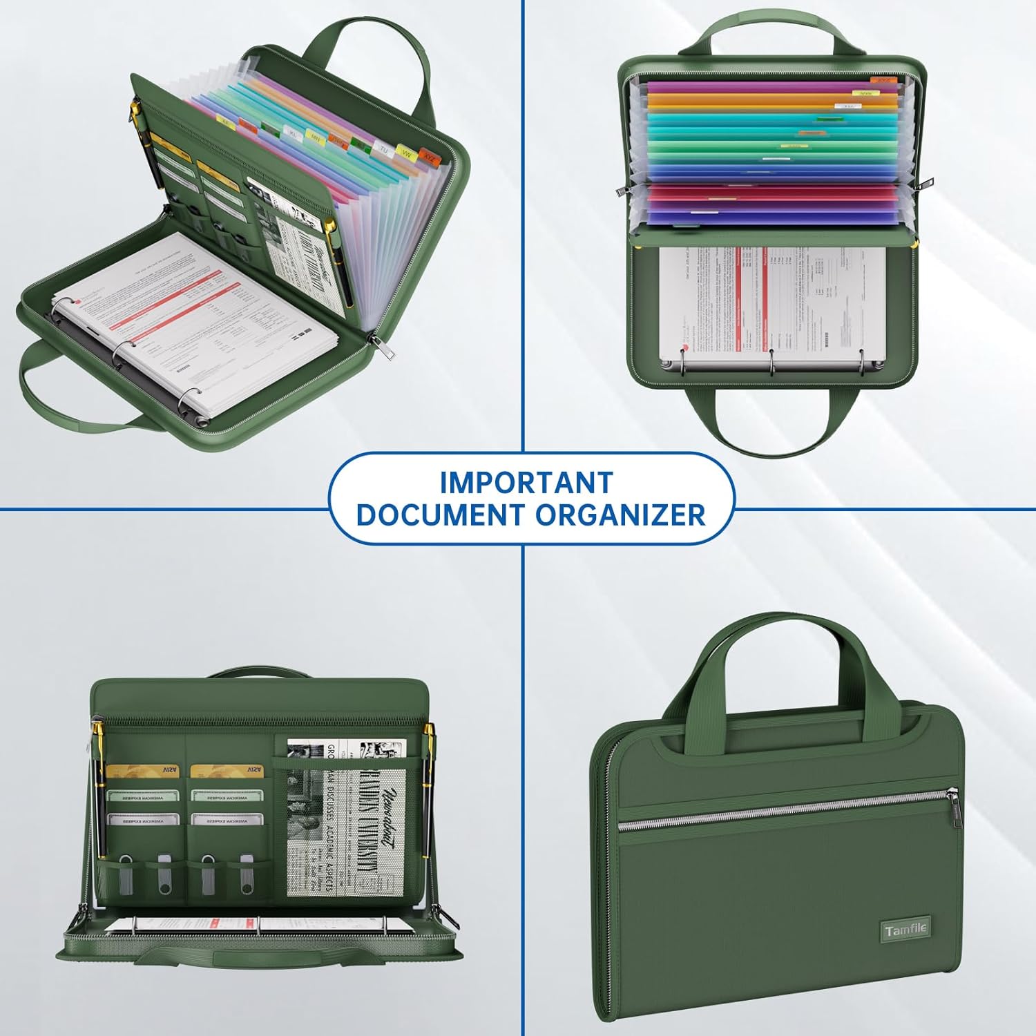 - Combining style with practicality - Tamfile designers have combined the organizational capabilities of a binder with the portability of an accordion folder. Inside, there are 3 rings (1.5 inches), and the 3 rings can hold your study materials and other files or paper protectors. There is also a 12-page accordion folder, a zippered pocket, 4 passport-sized pouches with 6 card slots + 4 USB slots.It is suitable for work, life, and learning scenarios.