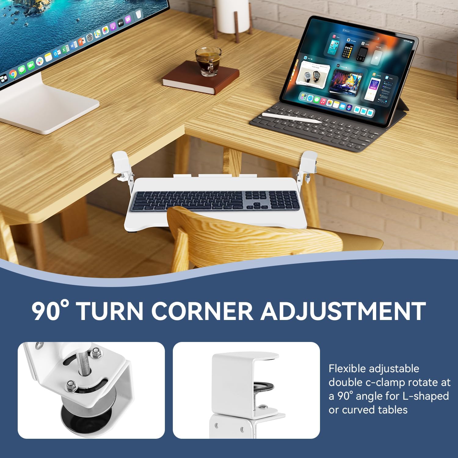 VUSIGN Keyboard Tray Under Desk Height Adjustable,Pull Out with Adjustable C Clamp Mount System for L-Shaped Tables, Extra Sturdy, 26.4” x 11.8” Slide-Out Platform Computer Drawer for Typing,White