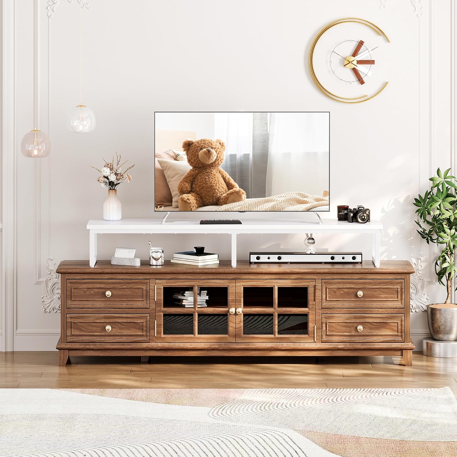 - 【Space Saving】- Raising the TV, the open storage space underneath the TV can be a good place for speakers, controllers, cable boxes, satellite receivers, and game consoles such as PS5, Xbox, and so on. The open space of the tv riser makes it easier to access cables and you don't have to worry about electronic devices overheating.