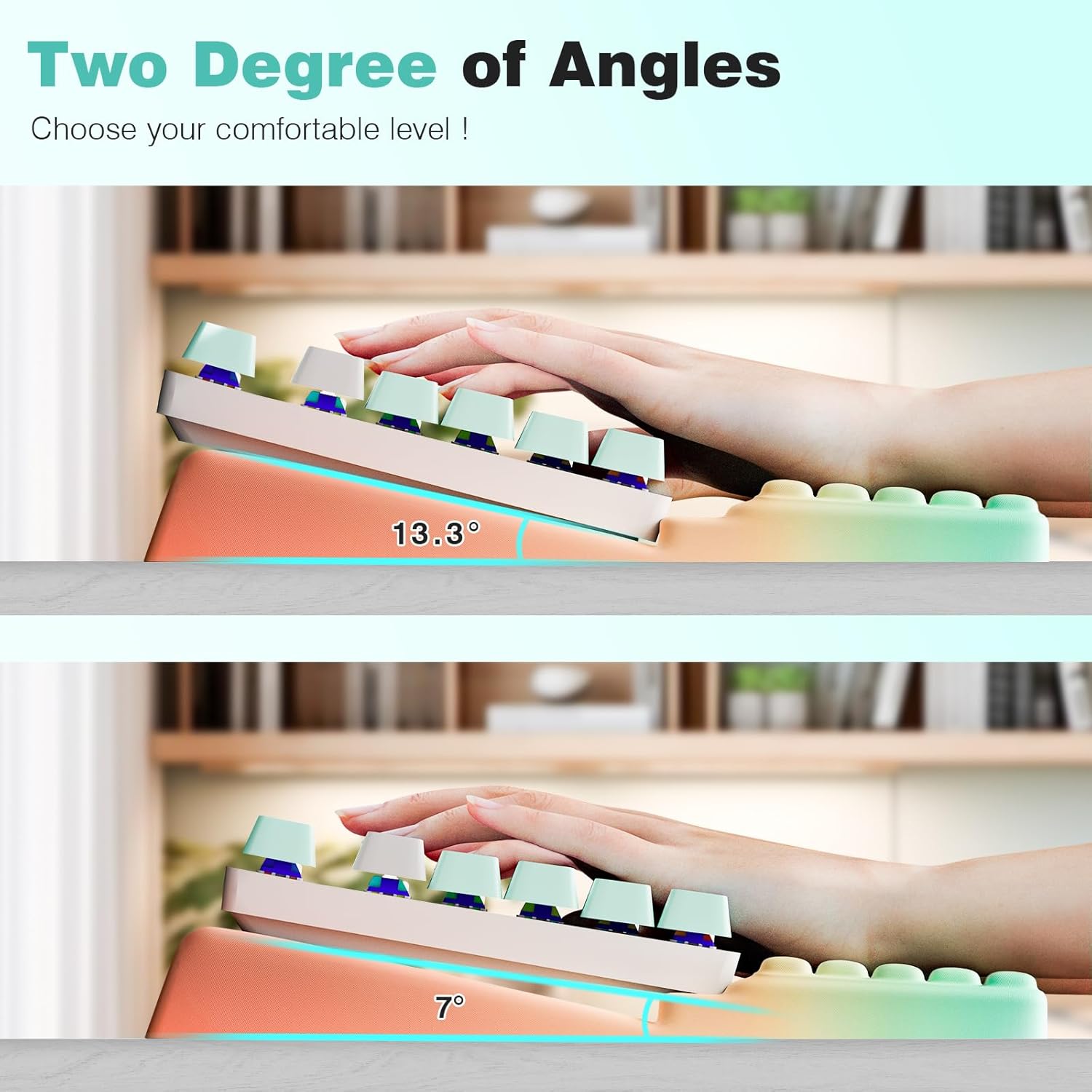 - Works with most keyboards and features two angle settings - adjust the tilt to match how you type for all-day comfort.