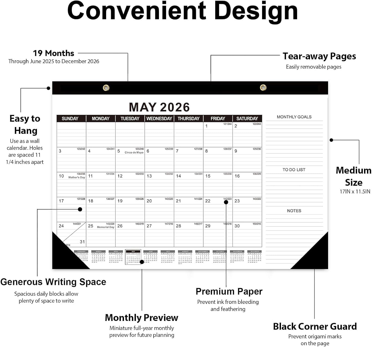 • EASY TO USE: Our large desktop calendar planner 2025-2026 is a great tool for long-term planning, 2 holes make it good for wall hanging. Two black corners keep pages flat during hanging or desktop use and the perforated design of each page allows you to tear off and move to the next month easily, averting disorder