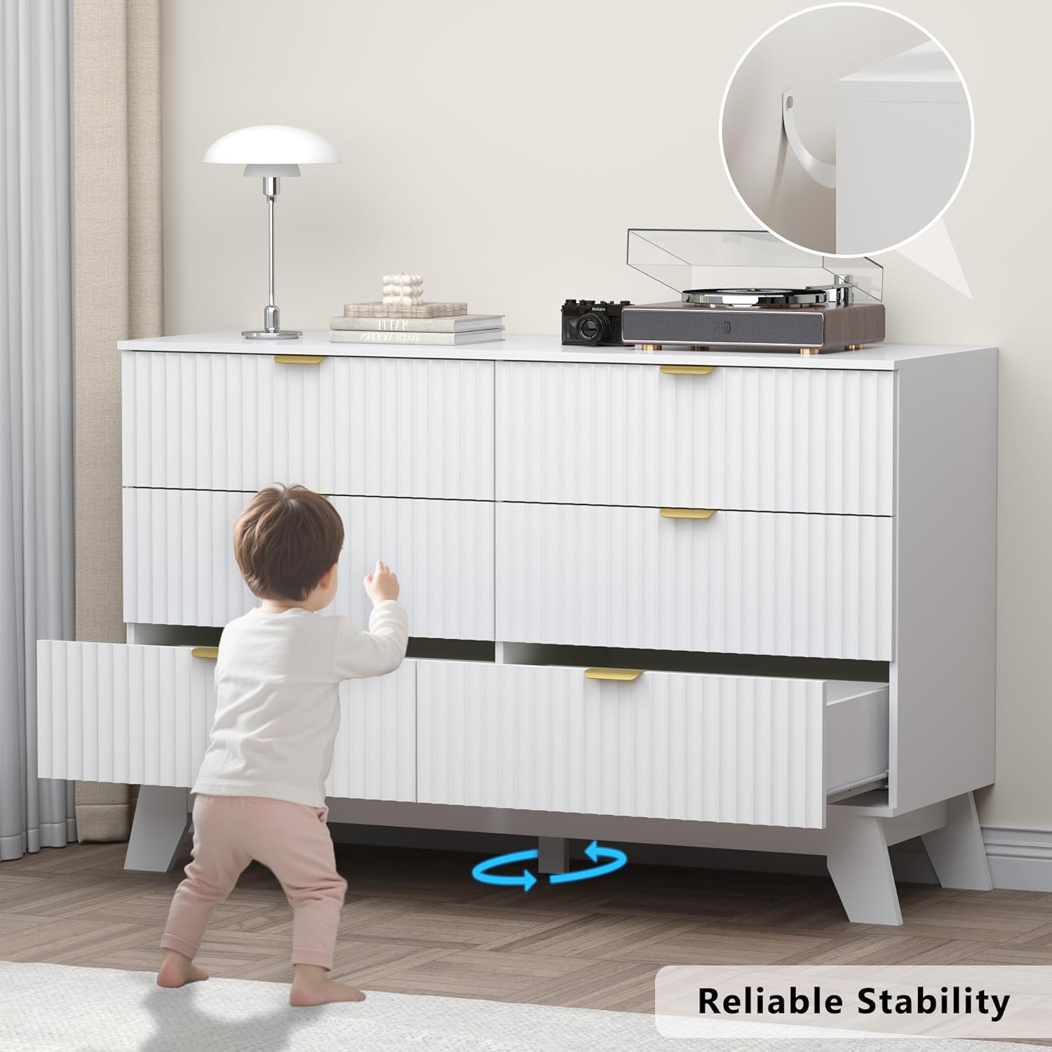 Fluted 6 Drawer Dresser, 47.2" Wide Modern Boho Chest of Drawers, Wooden Storage Dresser TV Stand for Bedroom, Living Room, Closet, Hallway, Curved Profile Design