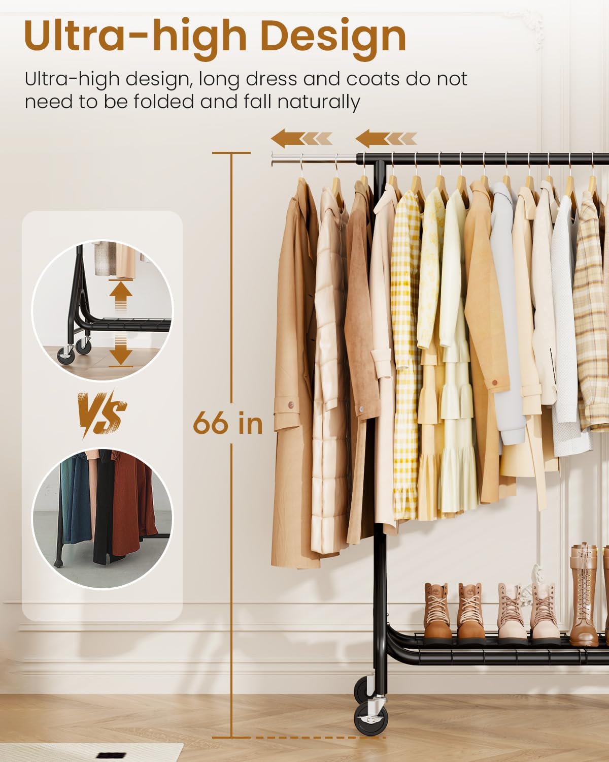 - šššššæš š¼ššæ ššš¼š½šš š¾ššššššš¾šššš: Our clothes rack adopts an innovative one-piece rod design, which ensures that the clothing rack are evenly supported, preventing sagging or bending. The triangle on the sides and dual U-shade rods on the bottom make the heavy duty clothing rack more stable and sturdy. The rolling rack can hold up to 450 pounds, so you can hang up heavy clothing, place luggage and more without worry.