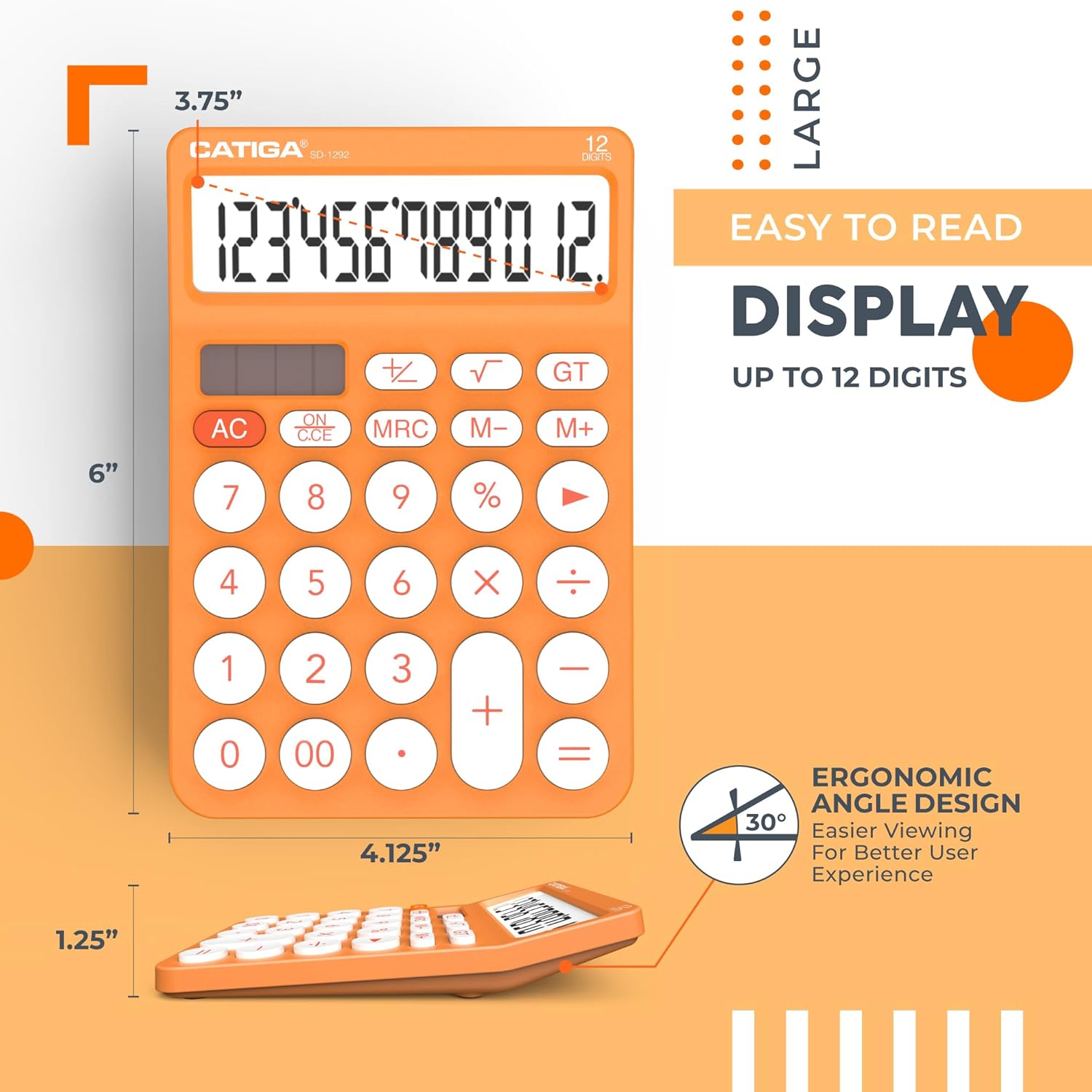 CATIGA 12 Digit Desktop Calculator Basic Desk Calculator with Large LCD Display, Big Buttons, 4 Function, Solar and Battery Dual Power, for Office, School, Home, SD-1292 Orange