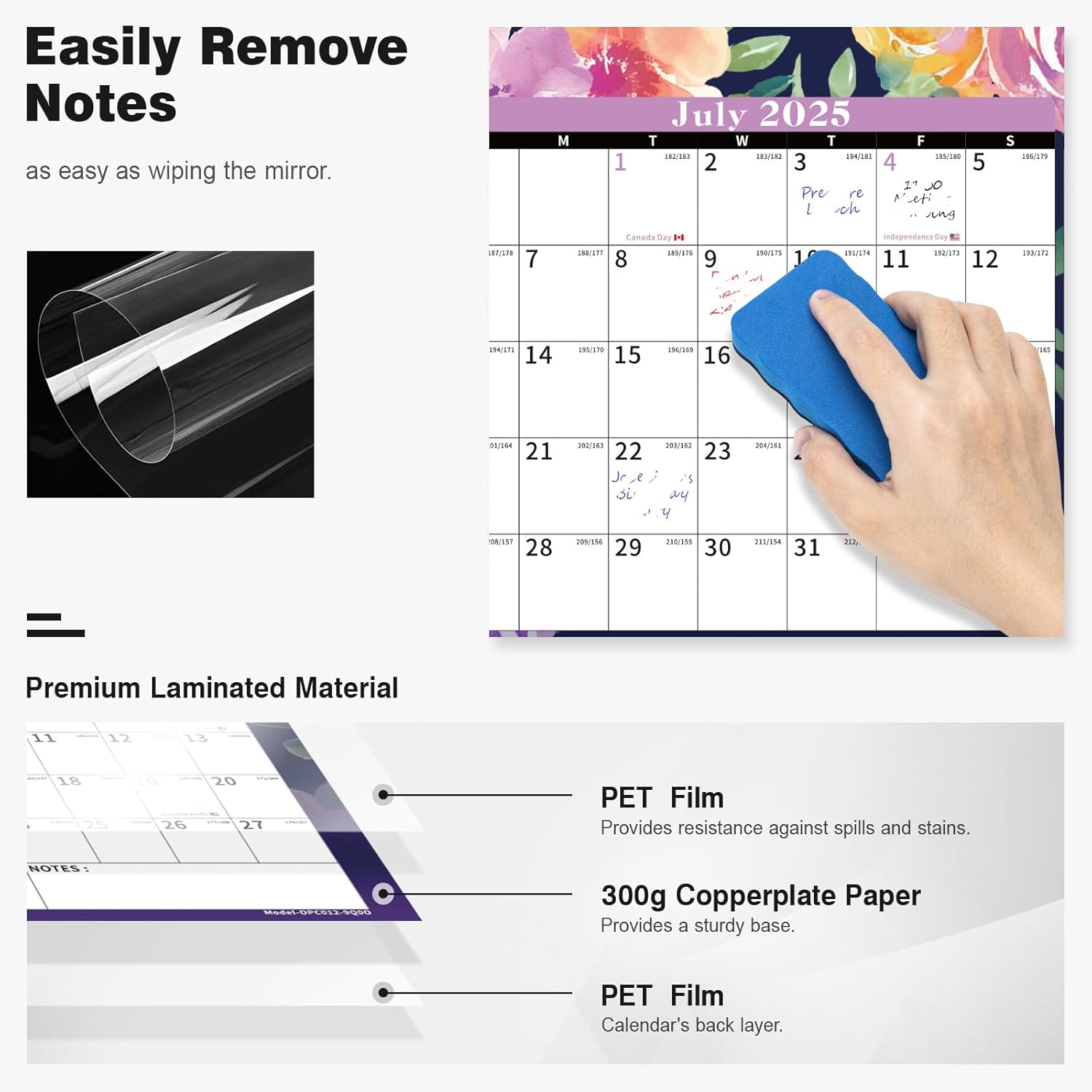 - ⨠Laminated Calendar with Dates: Waterproof wall calendar comes with a mini eraser, four dry-erase markers, 12 push pins, and 10 transparent round stickers. 12 months calendar covers the time range from July 2025 to June 2027, making it perfect for long-term use.