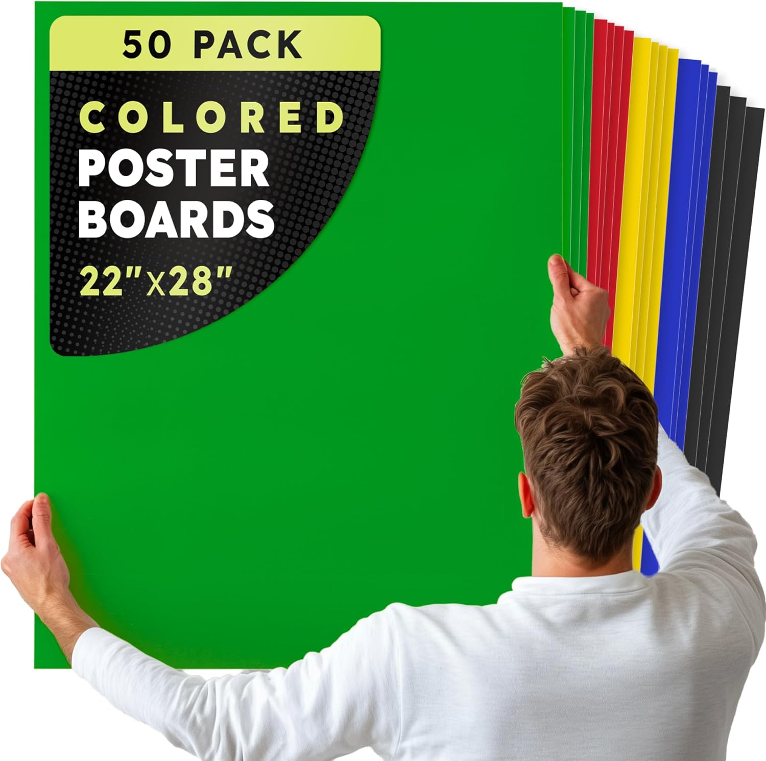 Hygloss Large Colored Poster Board 22x28 - 50 Assorted Standard Color Poster Boards Bulk Pack - Red, Yellow, Green, Blue, Black - 10 Pt. Thickness Poster Board Paper - Posterboard Multipack 22" x 28"