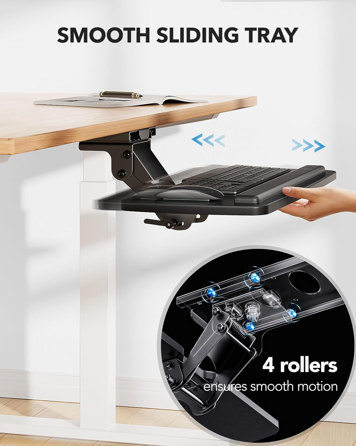 - Easy Assembly: All hardware and instructions included for quick assembly. Pro Tip: confirm this tray size is compatible with your desktop: no crossbar under your desk OR at least 14.17" clearance from the desktop edge( >16.22" for full keyboard slide-in), minimum desk thickness >0.6". The pull out keyboard tray weighs 10 lbs, please ensure your desk can support this under-mounted gear
