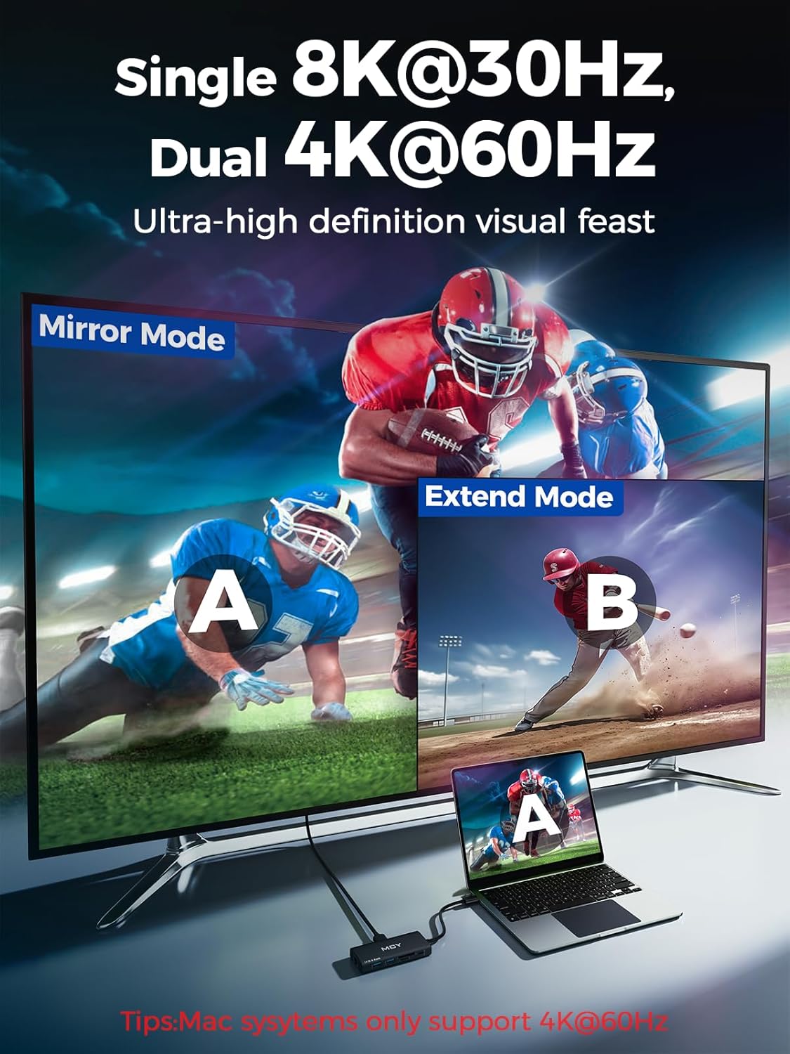 - ăDual Display Ultra HD OutputăThe docking station dual hdmi supports single 8K, dual 4K@60Hz mirror/extend modes. Ideal USB C to HDMI adapter for MacBook/Windows laptops. Ultra clear images bring you a visual feast!(Note:1ăHDMI1 8K requires DP1.4 protocol PC support (Mac systems only support 4K ). 2ăFor MAC, the display on both external monitors will be identical.)