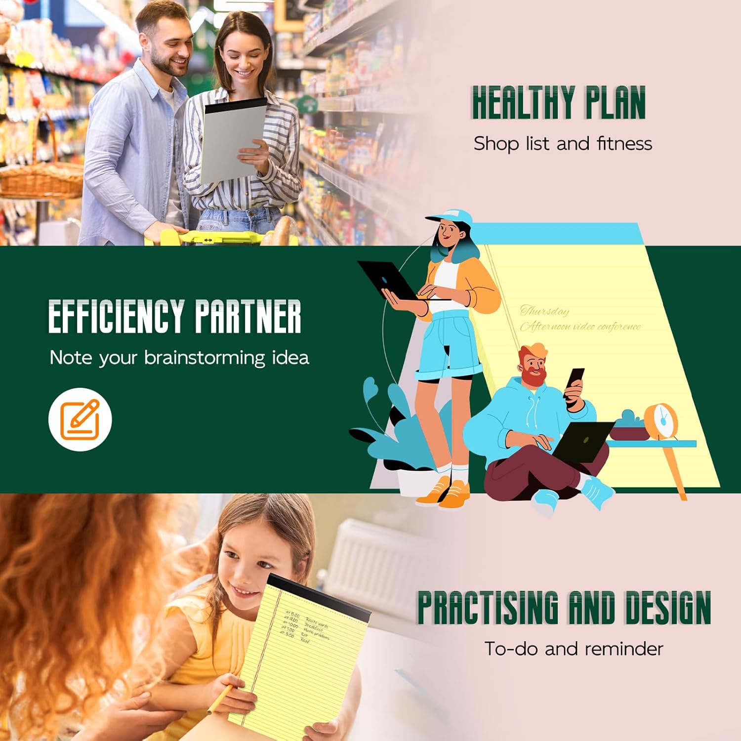 - 【Double-Sided Printing】The 8.5" x 14" yellow note pads is designed with double-sided printing, providing you with twice the writing space without wasting any paper. The legal pads 8.5 x 14 yellow with smooth paper, clear lines and colors, free of fibers without letting the nib bleed through to the back of the paper, helping record your unconstrained thinking and special moments, you don't need to worry about the inspiration being forgotten.