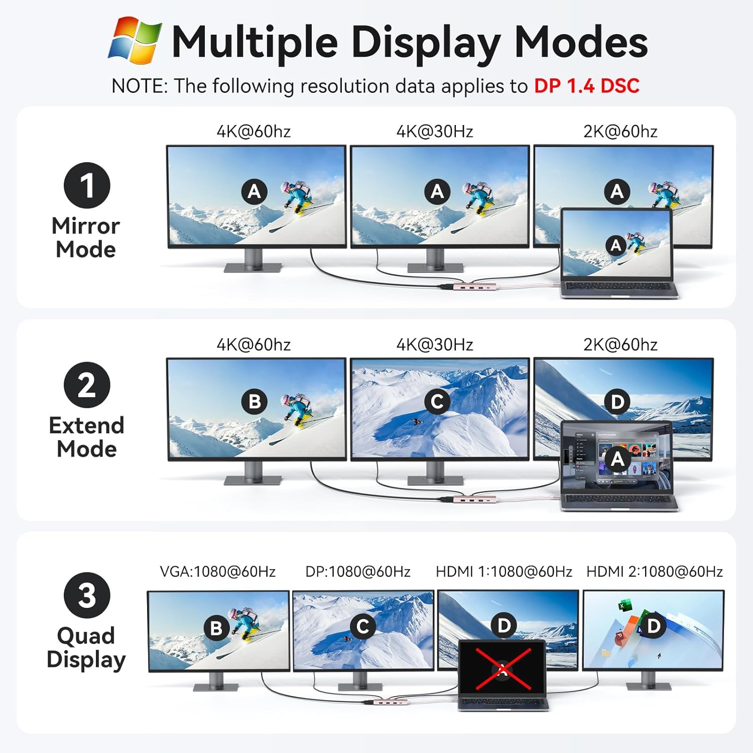 - Laptop Docking Station 4K Display Adapter: The USB C Docking Station Dual HDMI Splitter with 4 video output ports: 2 HDMI+DP+VGA. For single display, HDMI can reach 8K@30HZ or 4K@144HZ; For dual display and triple display, Can output up to 4K Dual/Triple Display videos(For laptop with DP 1.4 DSC); For quadruple display, Dual HDMI, DP, and VGA all are 1080@60Hz. Please make sure your laptop specification support DP1.4 signal output. If the VGA port is connected, it will affect the resolution of all displays up to 1080P only