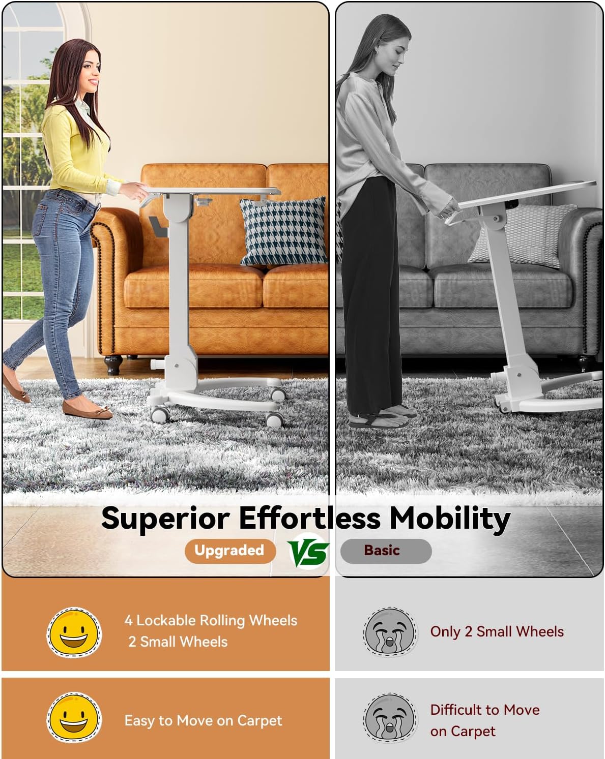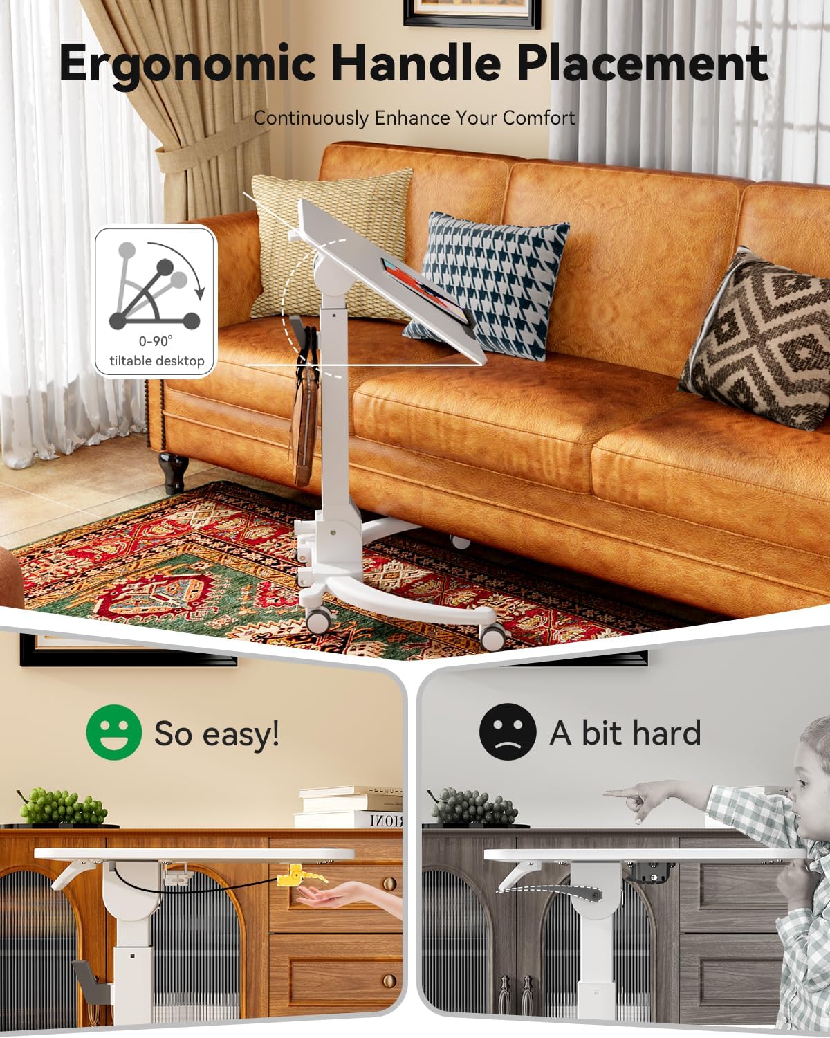 - More Ergonomic Handle Position: Previously, the flip handle was at the back of the tabletop, which was inconvenient. In the latest rolling desk, we moved the it to the front, making it easy for everyone, young and old, to use