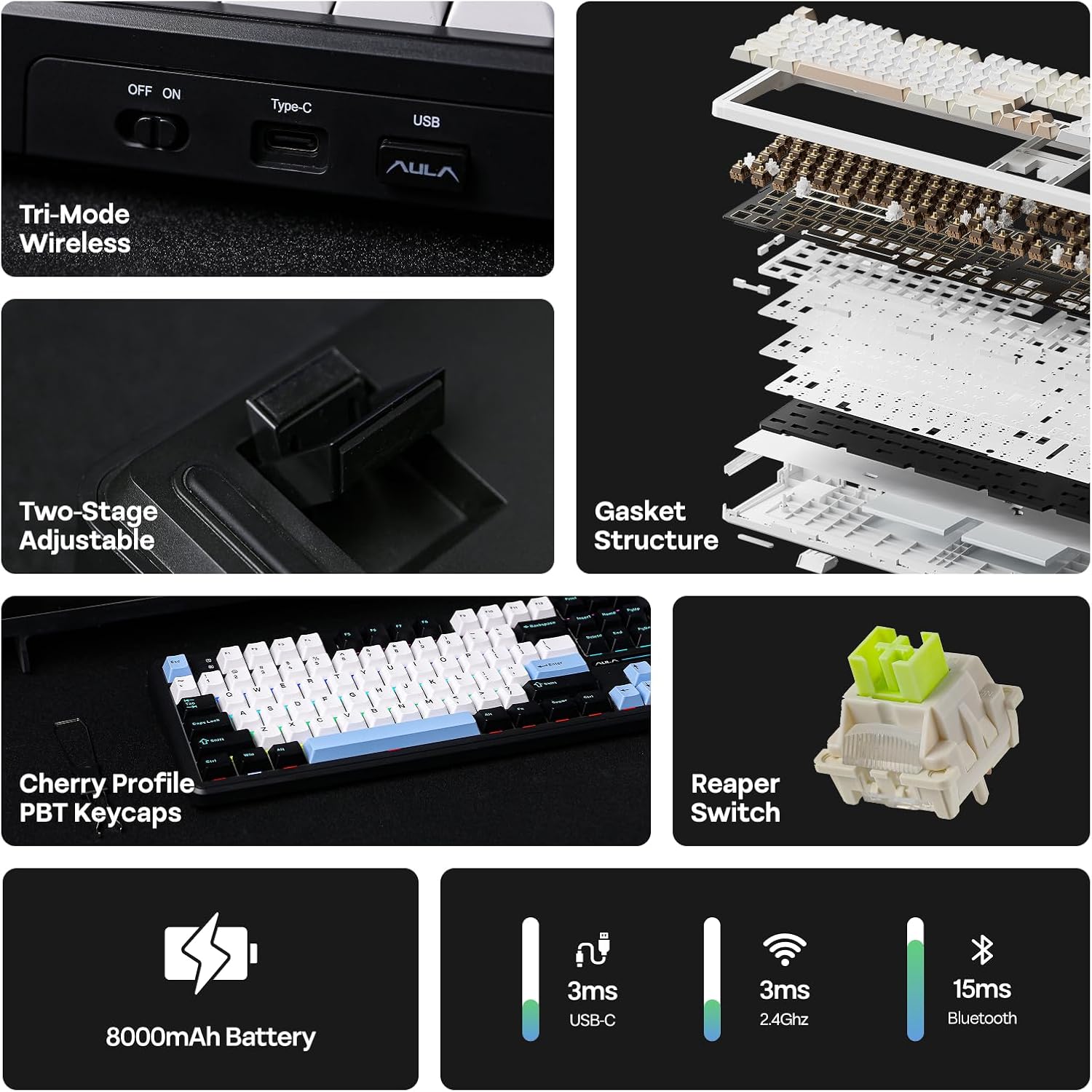 EPOMAKER X Aula F108 PRO Wireless Gaming Keyboard with Screen, 8000mAh Battery, 104 Hot-Swappable and Programmable Keys and Knob, RGB Backlight, for Mac/PC/Android (Blue&White&Black)