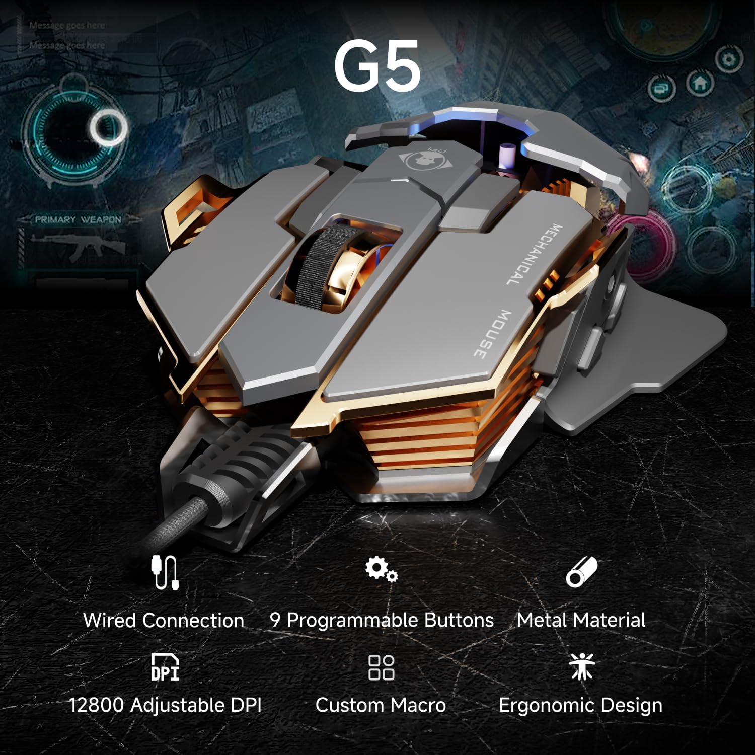 EWEADN G5 Wired Gaming Mouse, Ergonomic RGB Computer Mouse, 12800 Adjustable DPI, 9 Programmable Macro Buttons with Rapid Fire Key Compatible for PC/Laptop/Windows-Grey