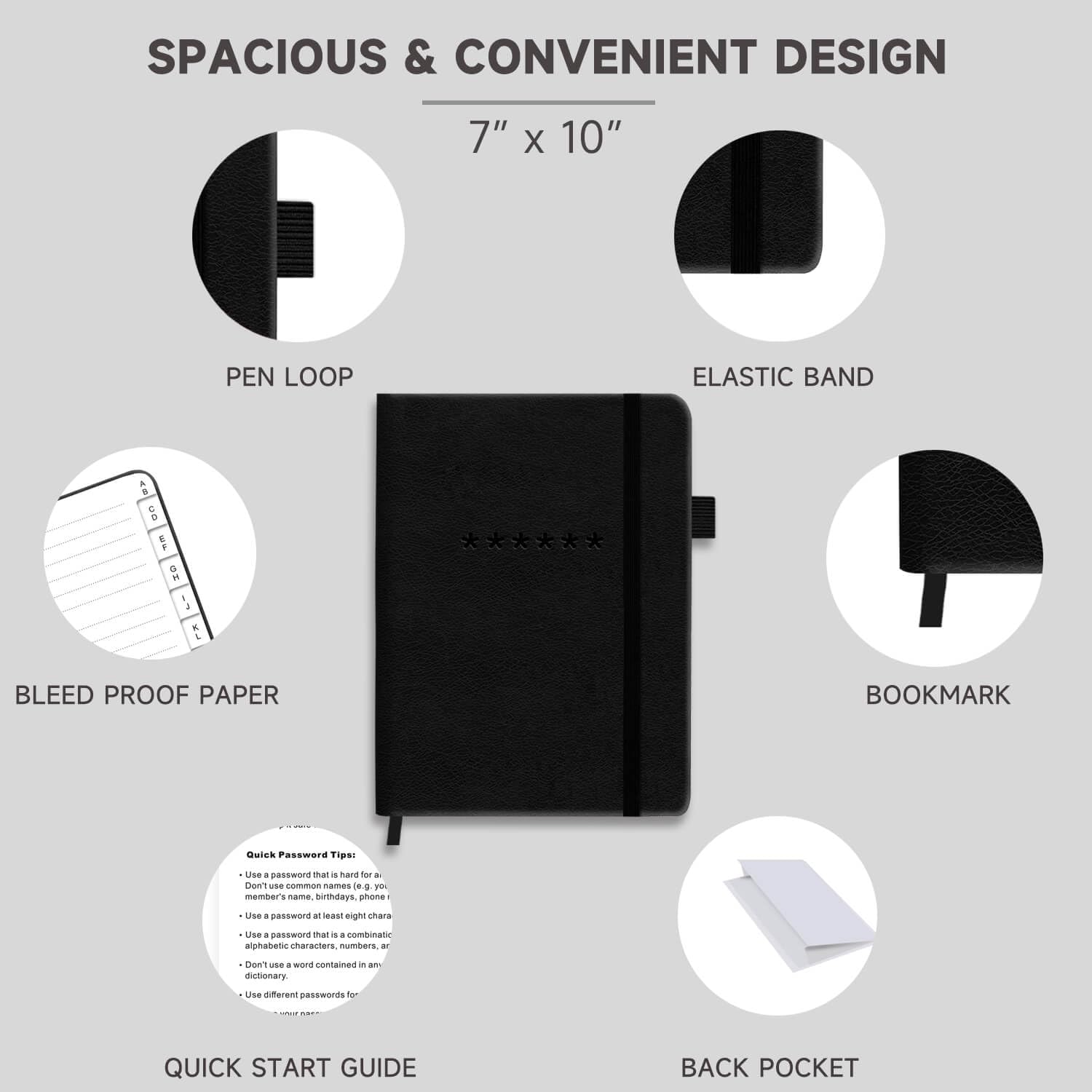 Password Book with Alphabetical Tabs – Hardcover Internet Address & Password Organizer – Password Keeper Notebook for Computer & Website – 7 x 10" Log-in Password Journal w/Thick Paper (Black)