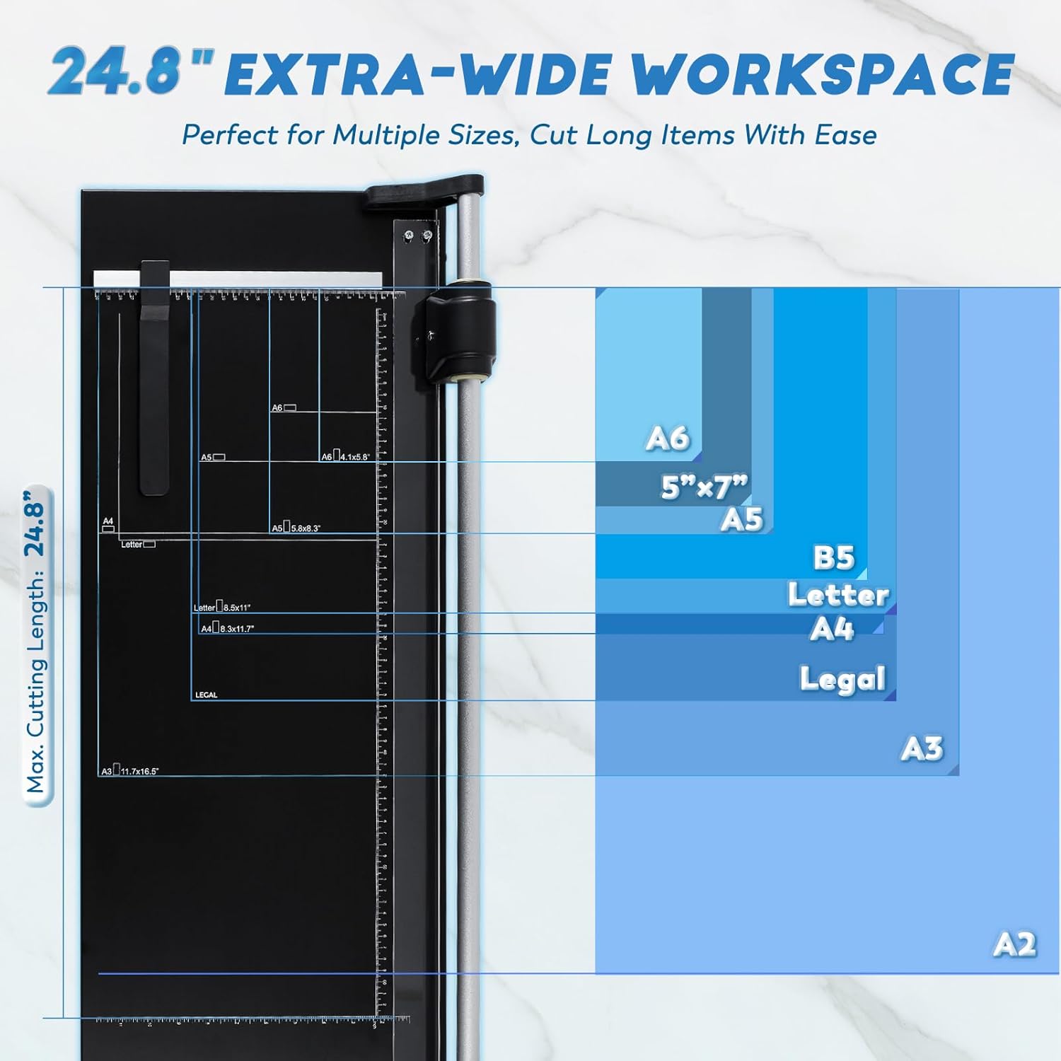 - 24.8" FOR VERSATILE USE: Tackle projects of any scale with 24.8" cutting length, compatible with A3, A4, 5×7" and custom paper sizes. Effortlessly handle copy paper, cardstock, photo paper, cardboard, and thin films, etc.—perfect for offices, home DIY crafts, schools, and photo studios.