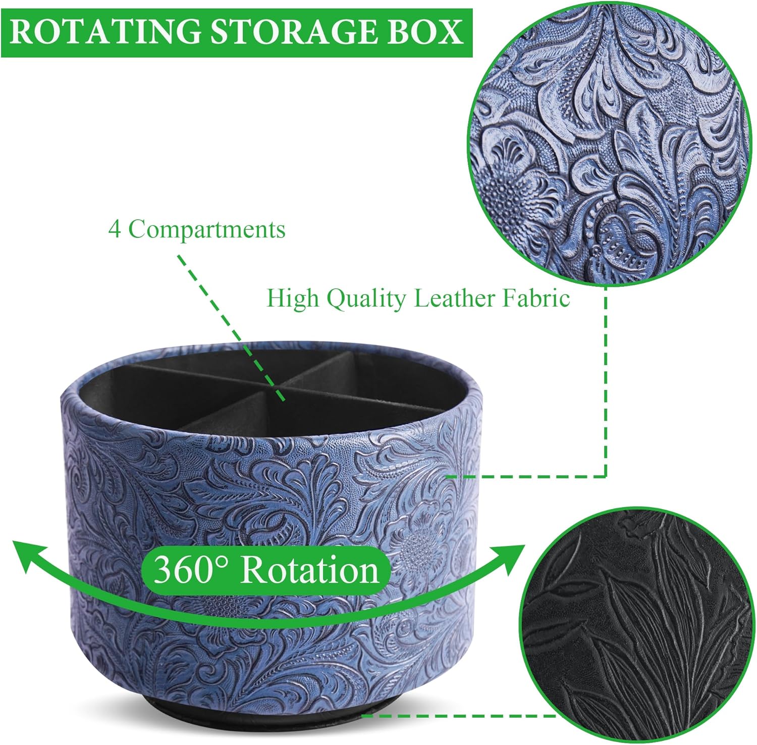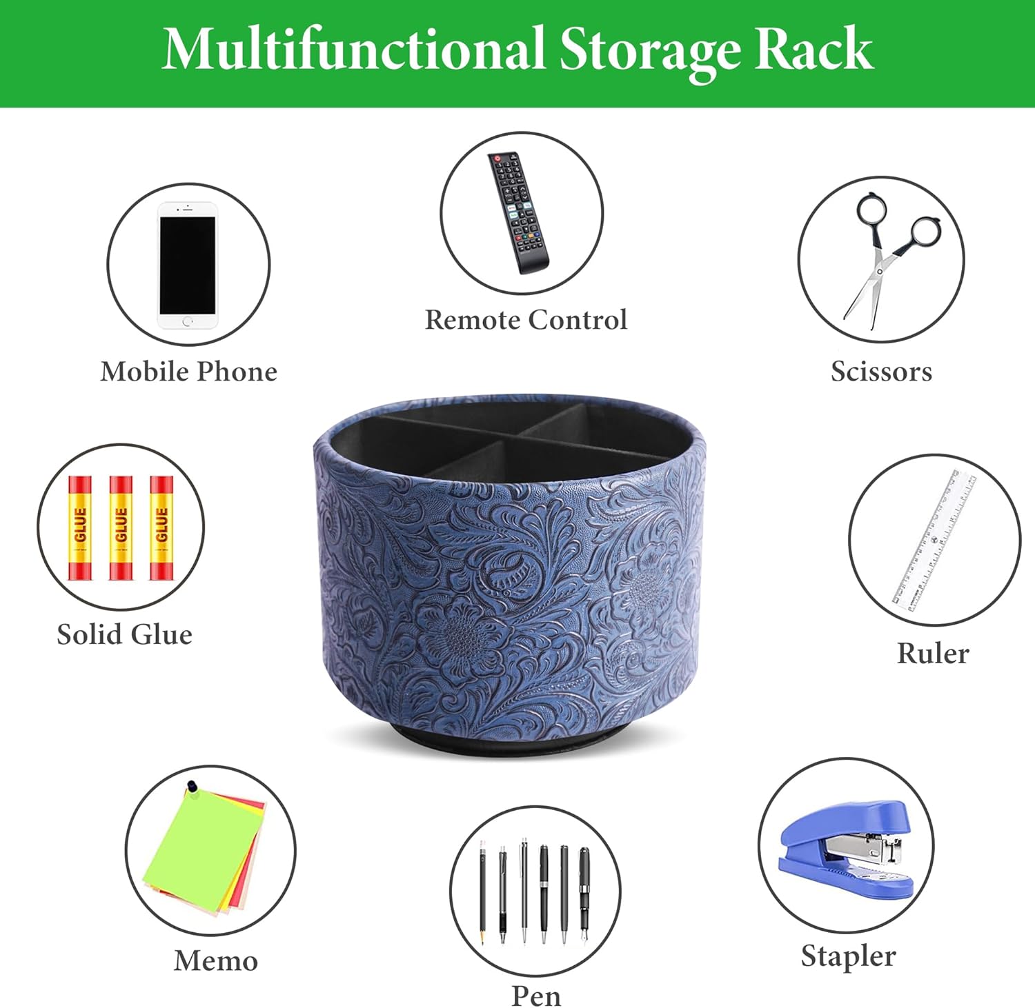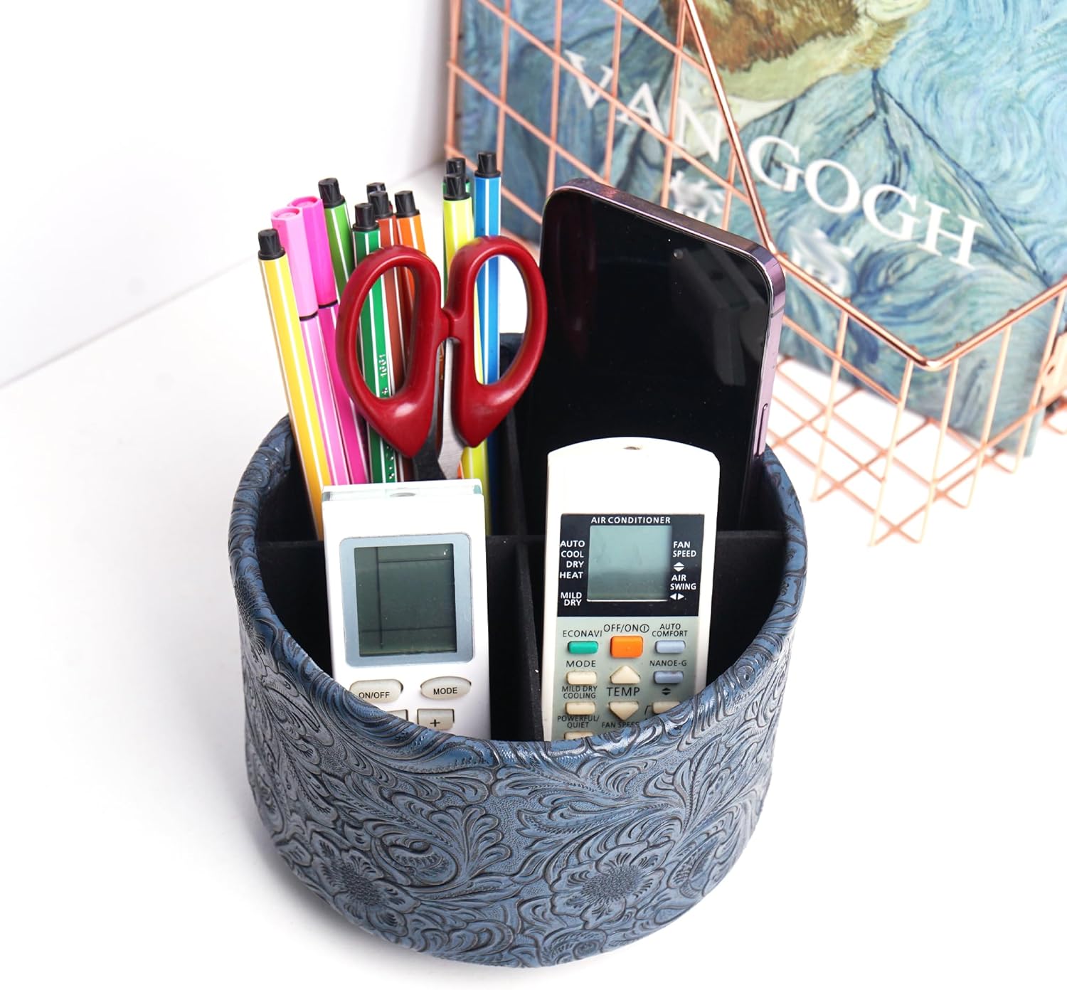 lizimandu Round Leather Art Supply Organizer,Remote Control Holder,360 Degree Spinning,Multi-Functional Pencil Holder,4 Compartments Desktop Stationary Organizer(1-Carved Dark Blue)