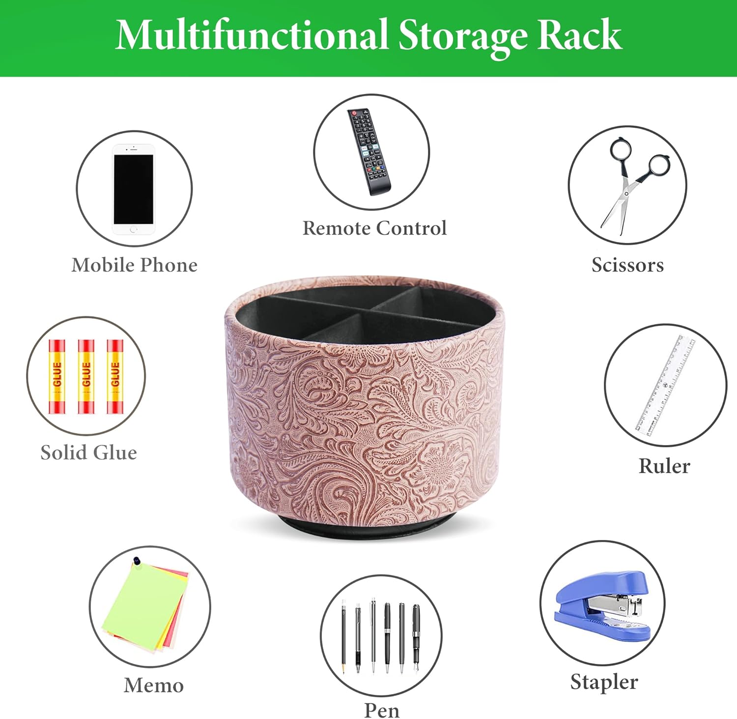 lizimandu Round Leather Art Supply Organizer,Remote Control Holder,360 Degree Spinning,Multi-Functional Pencil Holder,4 Compartments Desktop Stationary Organizer(1-Carved Wood Beige)