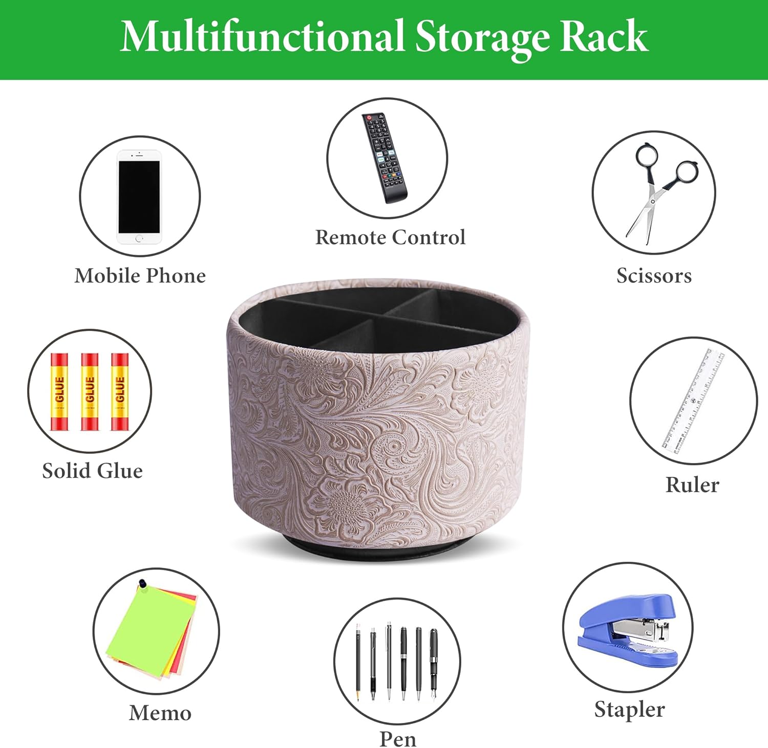 lizimandu Round Leather Art Supply Organizer,Remote Control Holder,360 Degree Spinning,Multi-Functional Pencil Holder,4 Compartments Desktop Stationary Organizer(1-Carved White)