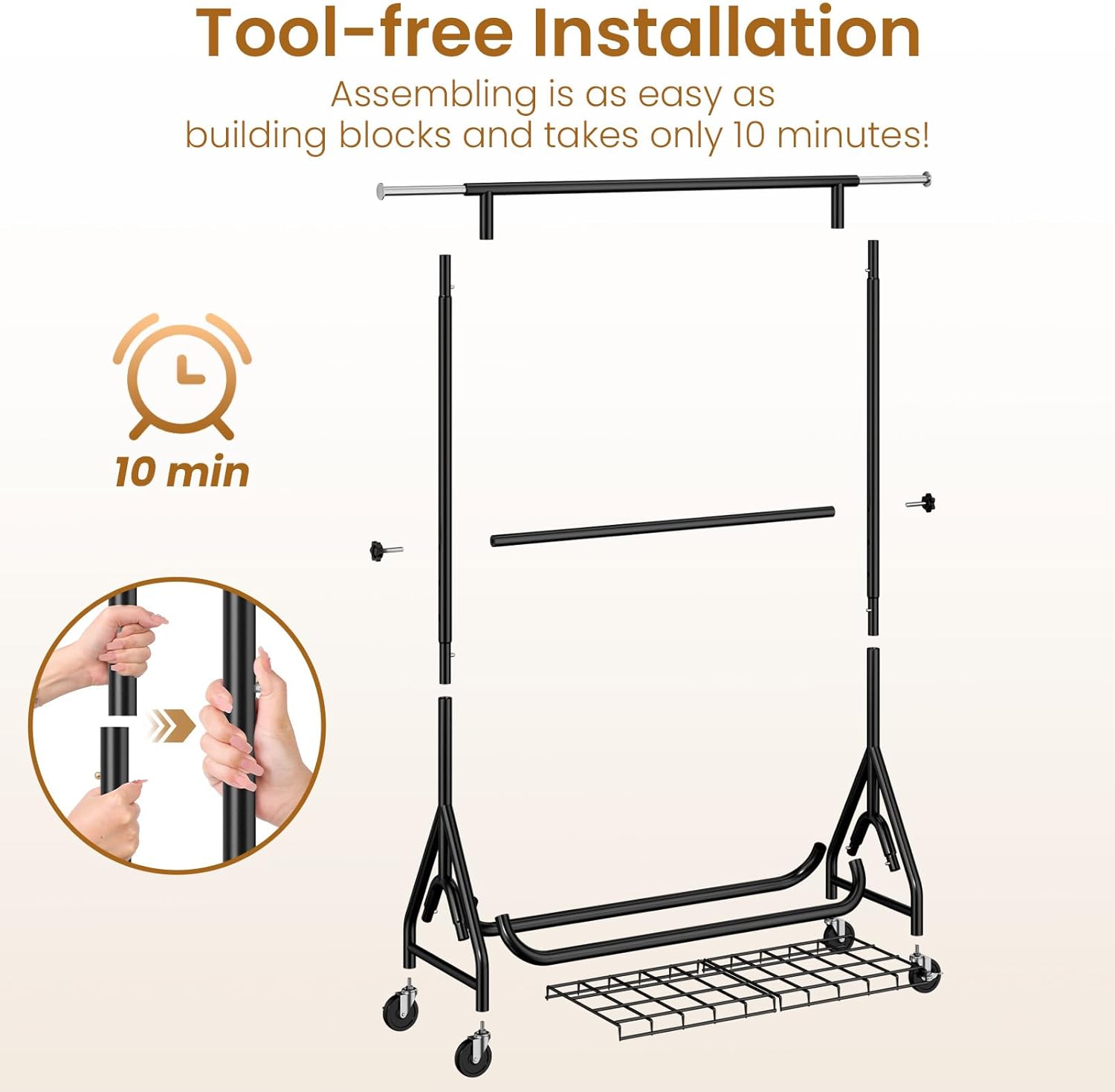 - šš¼šš šš š¼ššššš½šš: The hanging clothes rack has been carefully designed with simple components, no need to worry about missing parts and tools. Secondary installation or disassembly can be done in 1 minute without tools, perfect for yard sales, seasonal storage, making assembling metal clothes rack easy and simple, saving you a lot of time. You can assemble our rolling racks with the help of the instructions or refer to our installation video.