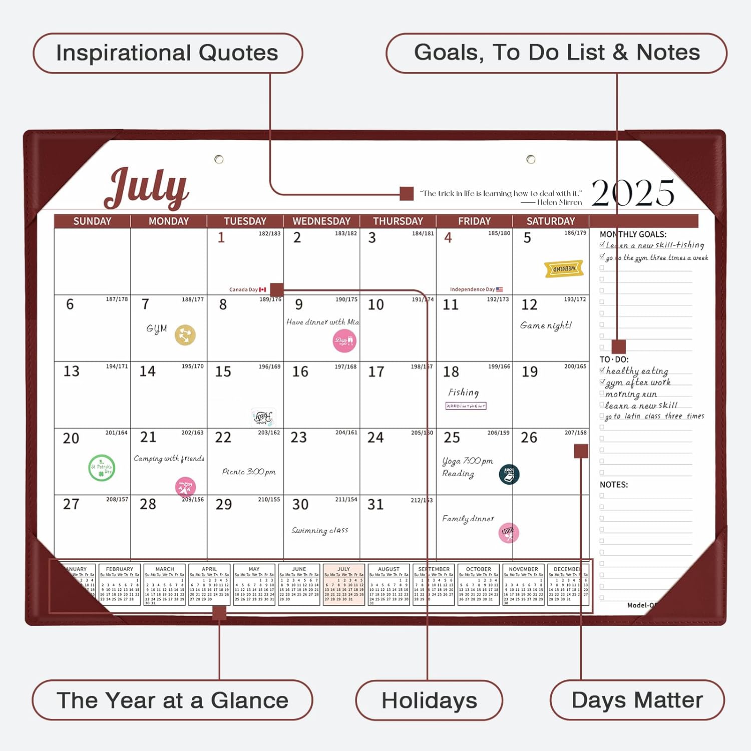 - Two Ways to Use It: The calendar can be placed on the desktop or hung on the wall by using our matching detachable string. Two hanging holes enable it to also be used as a wall calendar. In addition, the matching faux leather pad can be used as a desk mat or mouse pad.
