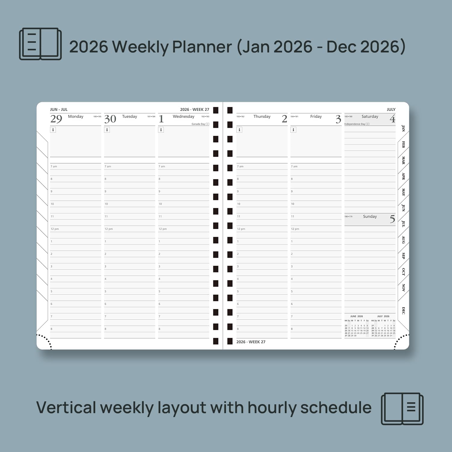 - VERTICAL HOURLY LAYOUT: The weekly layout includes ample space to write (from 7:00am to 8:00pm). A week is laid to view on 2 pages. Each monthly layout contains an overview of the month and a notes section.