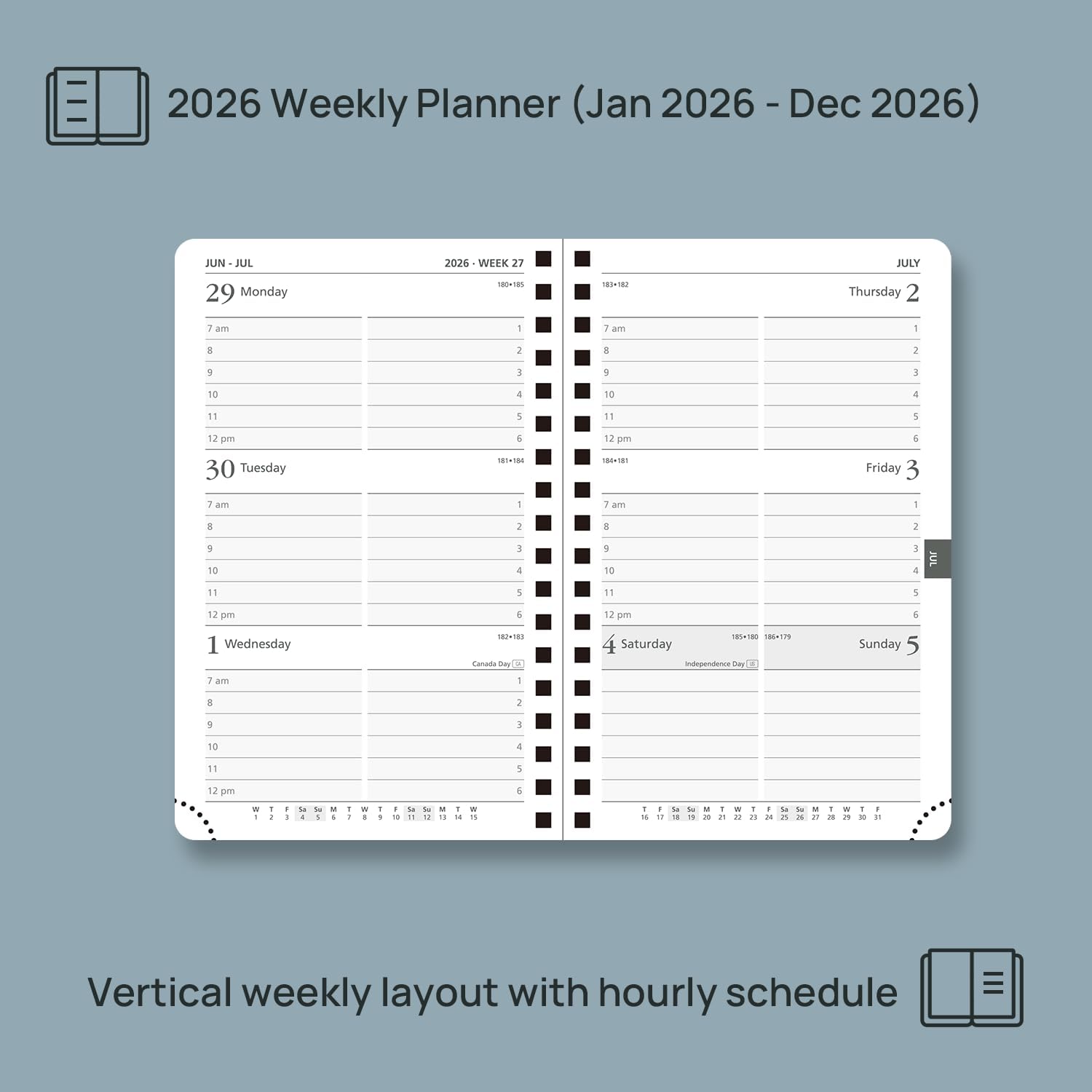- VERTICAL HOURLY LAYOUT: The weekly layout includes ample space to write (from 7:00am to 8:00pm). A week is laid to view on 2 pages. Each monthly layout contains an overview of the month and a notes section.