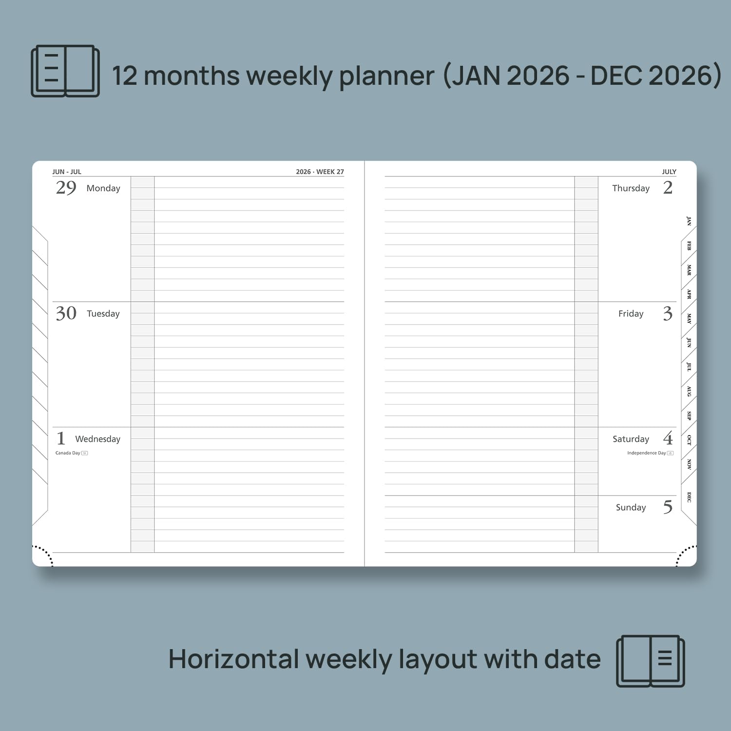- JAN 2026 - DEC 2026 WEEKLY PLANNER: The size is Large 8.5" x 10.5", which permits large writting space for your appointments, which makes your busy daily routines organized.