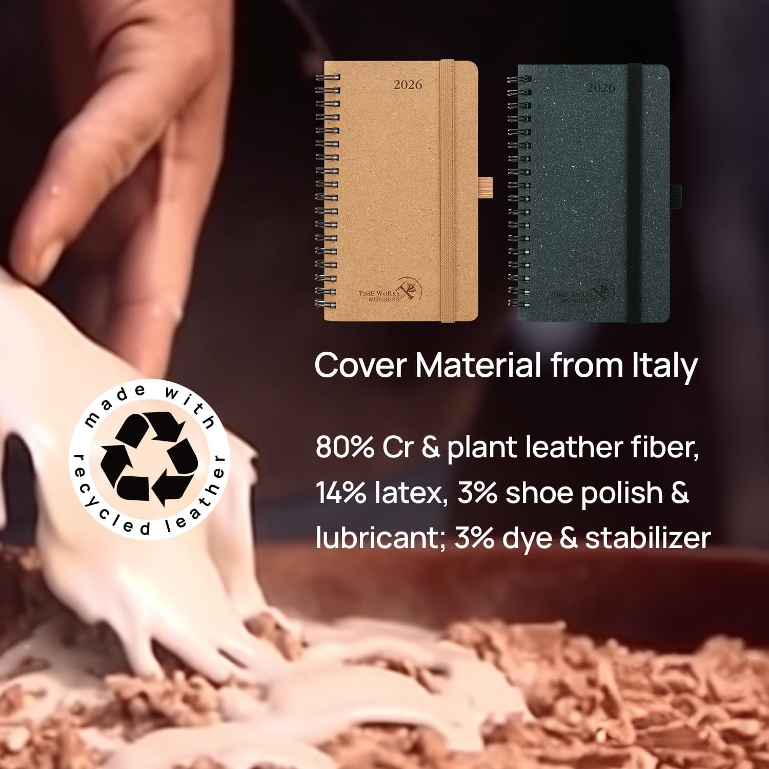 POPRUN 2026 Recycled Weekly Planner 12 Months Pocket Size (3.5'' x 6.5'') - Spiral Calendar Weekly and Monthly for Purse, with Italian Regenrated Leather, Pen Holder - Desert Brown
