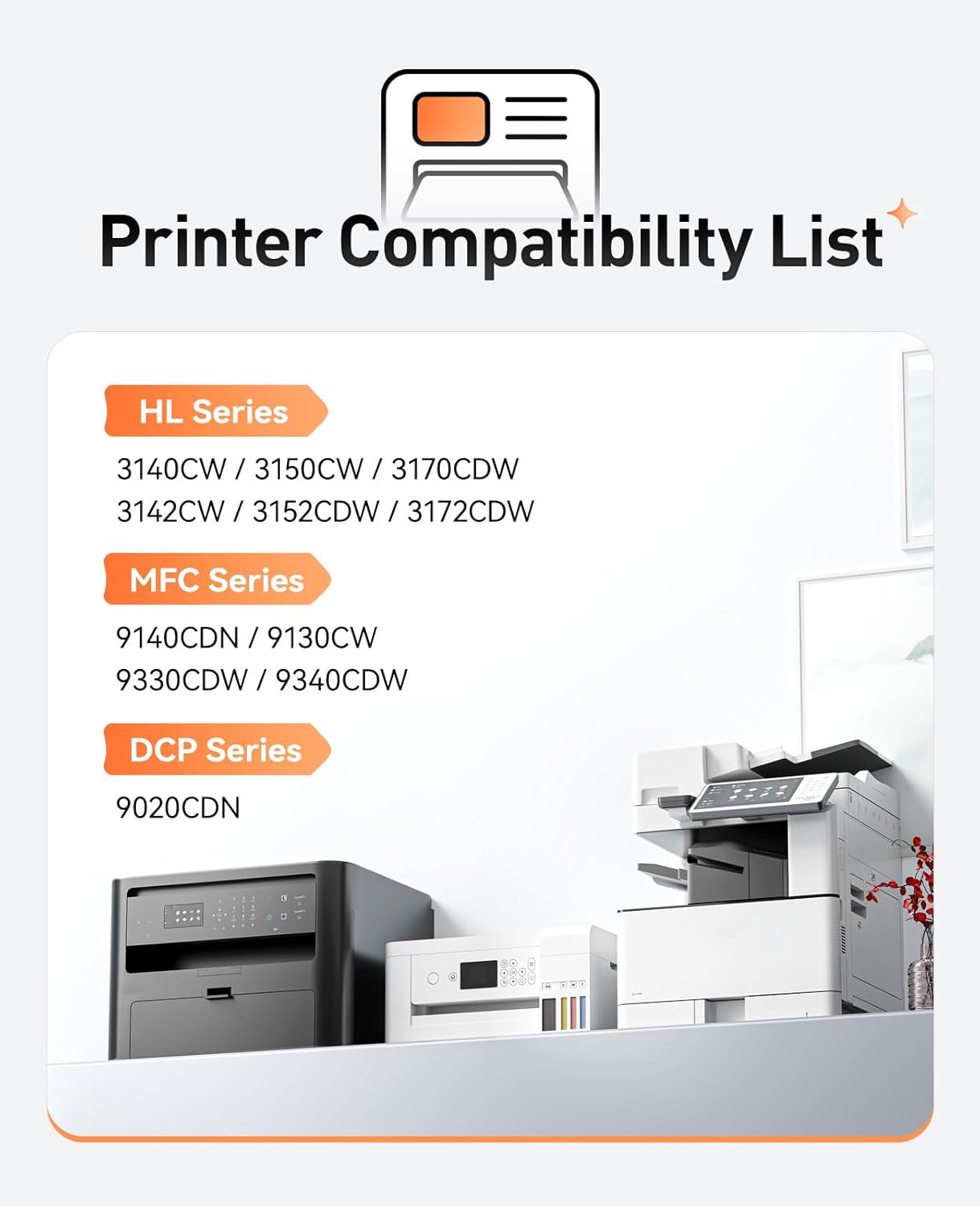 - Compatible Printers: Compatible with Brother DCP Printer Series:DCP-9020CDN. HL Printer Series:HL-3140CW, HL-3150CW, HL-3170CDW, HL-3142CW, HL-3152CDW, HL-3172CDW. MFC Printer Series:MFC-9140CDN, MFC-9130CW, MFC-9330CDW, MFC-9340CDW.