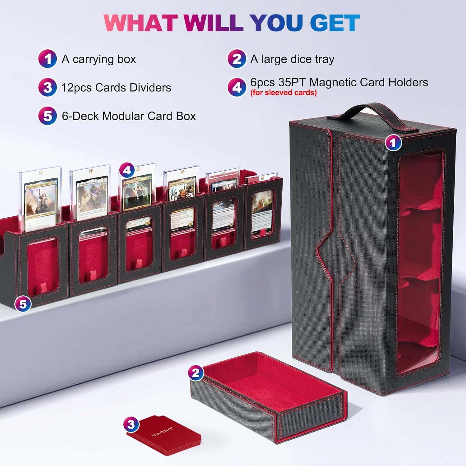 Commander Deck Box for MTG, 6-Deck Modular Card Case with Dice Tray Holds 600+ Double-sleeved Cards, Removable Trading Cards Storage Box with 35PT Magnetic Card Holders for TCG, Black Red