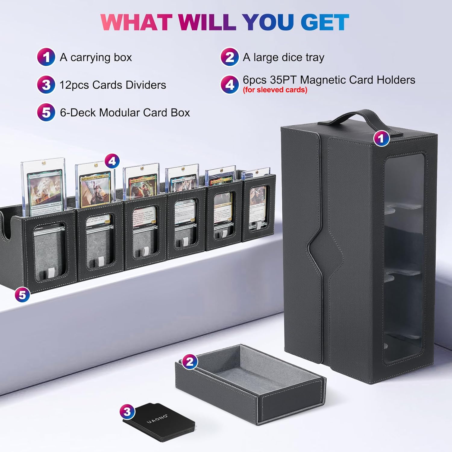 Commander Deck Box for MTG, 6-Deck Modular Card Case with Dice Tray Holds 600+ Double-sleeved Cards, Removable Trading Cards Storage Box with 35PT Magnetic Card Holders for TCG, Black Grey