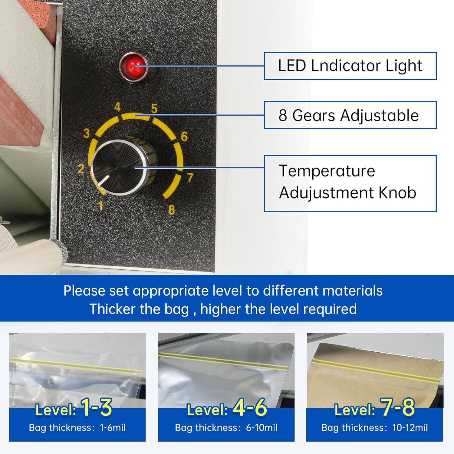 - [Instantly use and optimal results]: With no warm-up time needed, our R-PACK Impulse Heat Sealer is ready to use right away. Simply keep the handle pressed down for 3-5 seconds to achieve perfect seals every time. The lightweight design and 8 stalls temperature adjustment feature allow for easy operation and compatibility with different materials bags.
