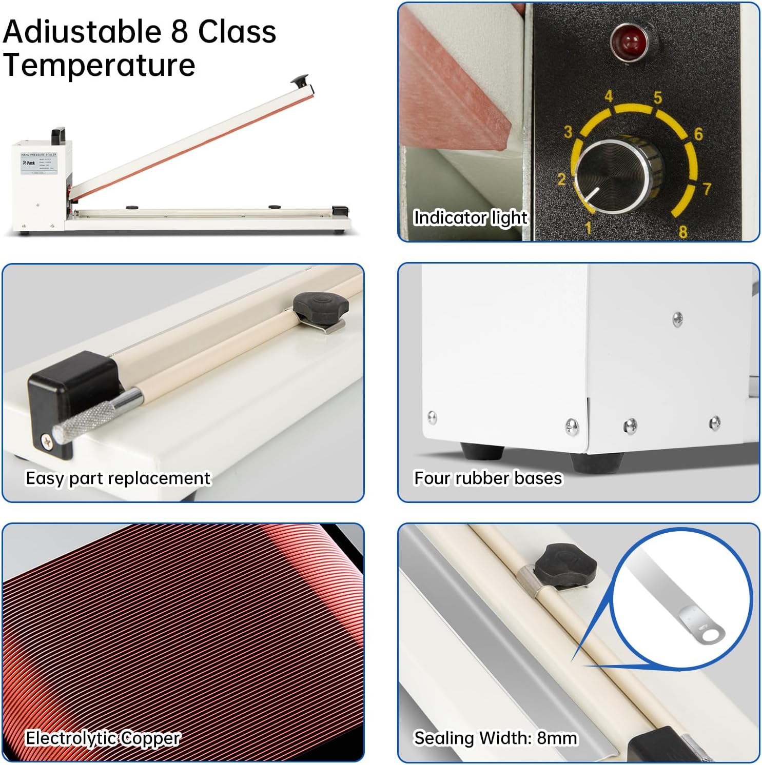 - [Instantly use and optimal results]: With no warm-up time needed, our R-PACK Impulse Heat Sealer is ready to use right away. Simply keep the handle pressed down for 3-5 seconds to achieve perfect seals every time. The lightweight design and 8 stalls temperature adjustment feature allow for easy operation and compatibility with different materials bags.