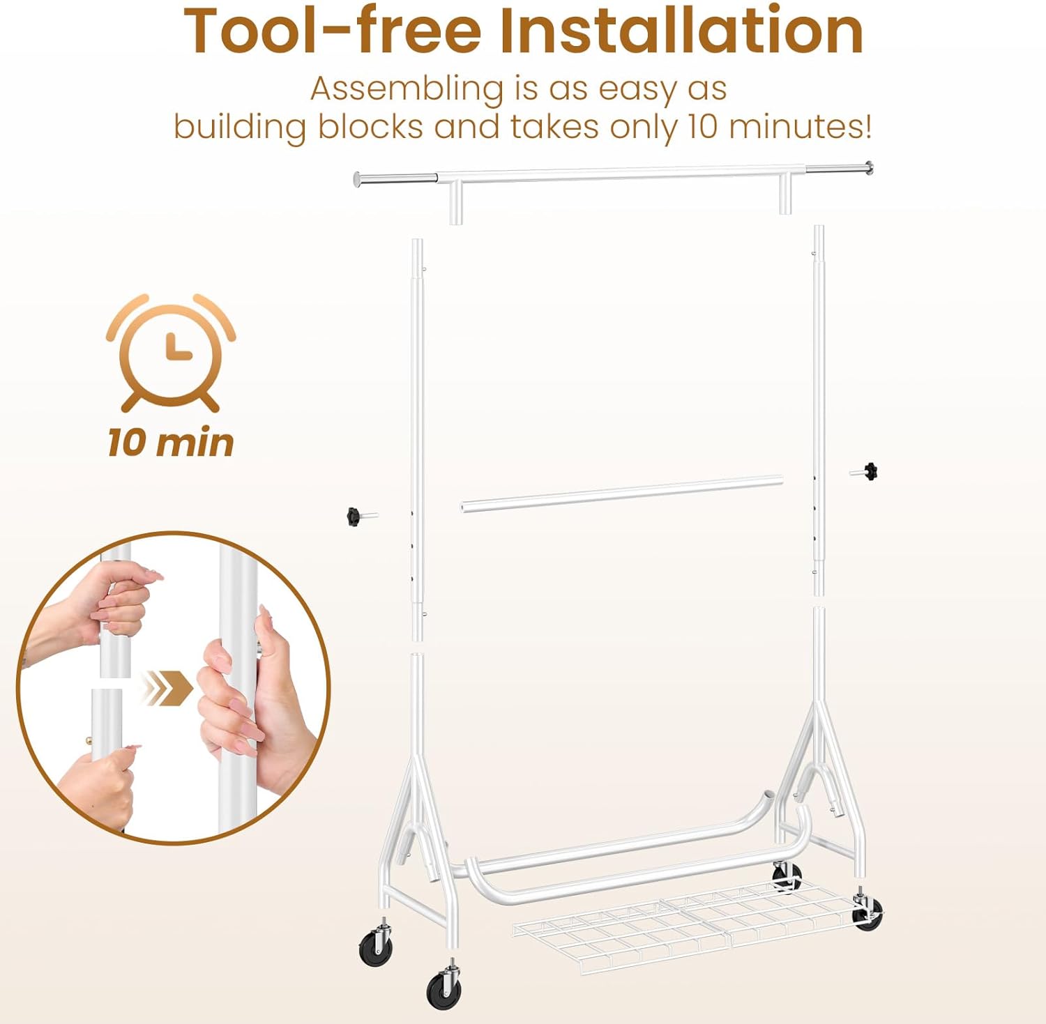 - šš¼šš šš š¼ššššš½šš: The hanging clothes rack has been carefully designed with simple components, no need to worry about missing parts and tools. Secondary installation or disassembly can be done in 1 minute without tools, perfect for yard sales, seasonal storage, making assembling metal clothes rack easy and simple, saving you a lot of time. You can assemble our rolling racks with the help of the instructions or refer to our installation video.