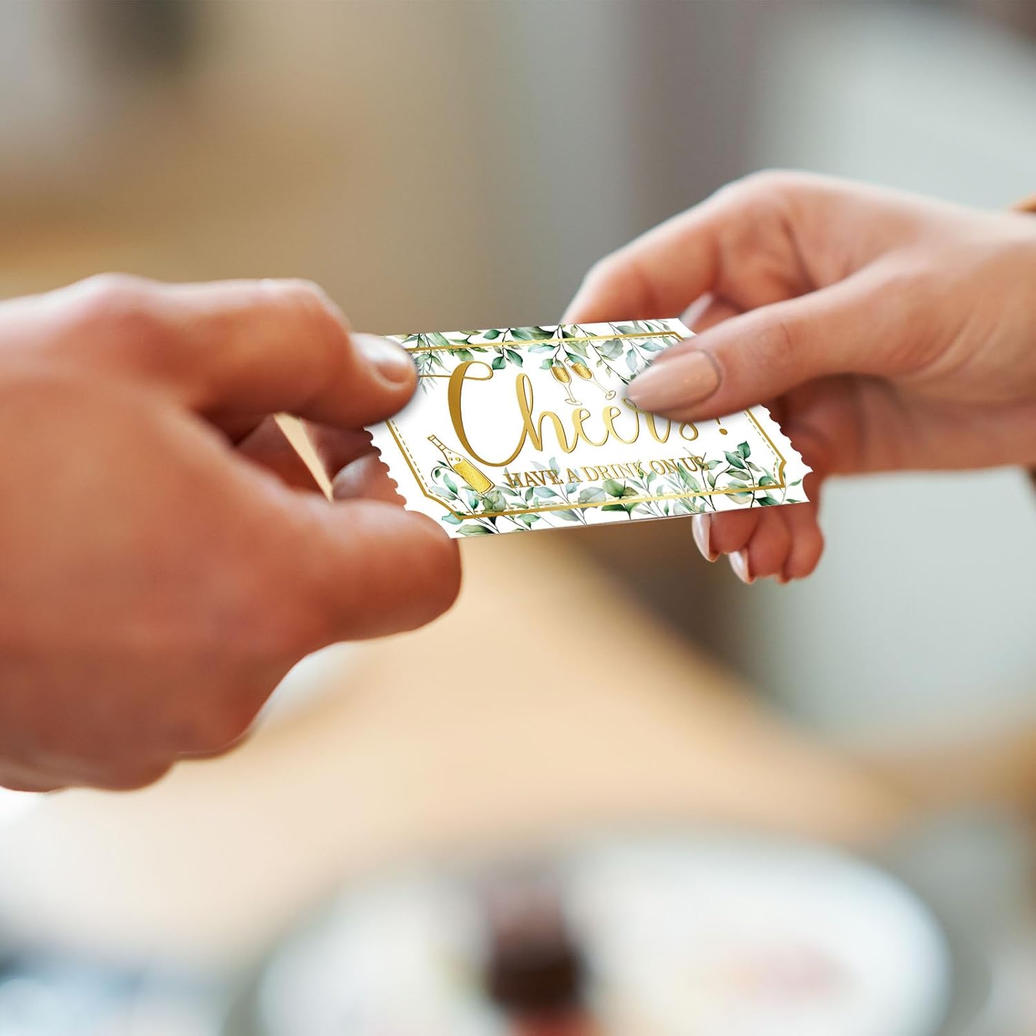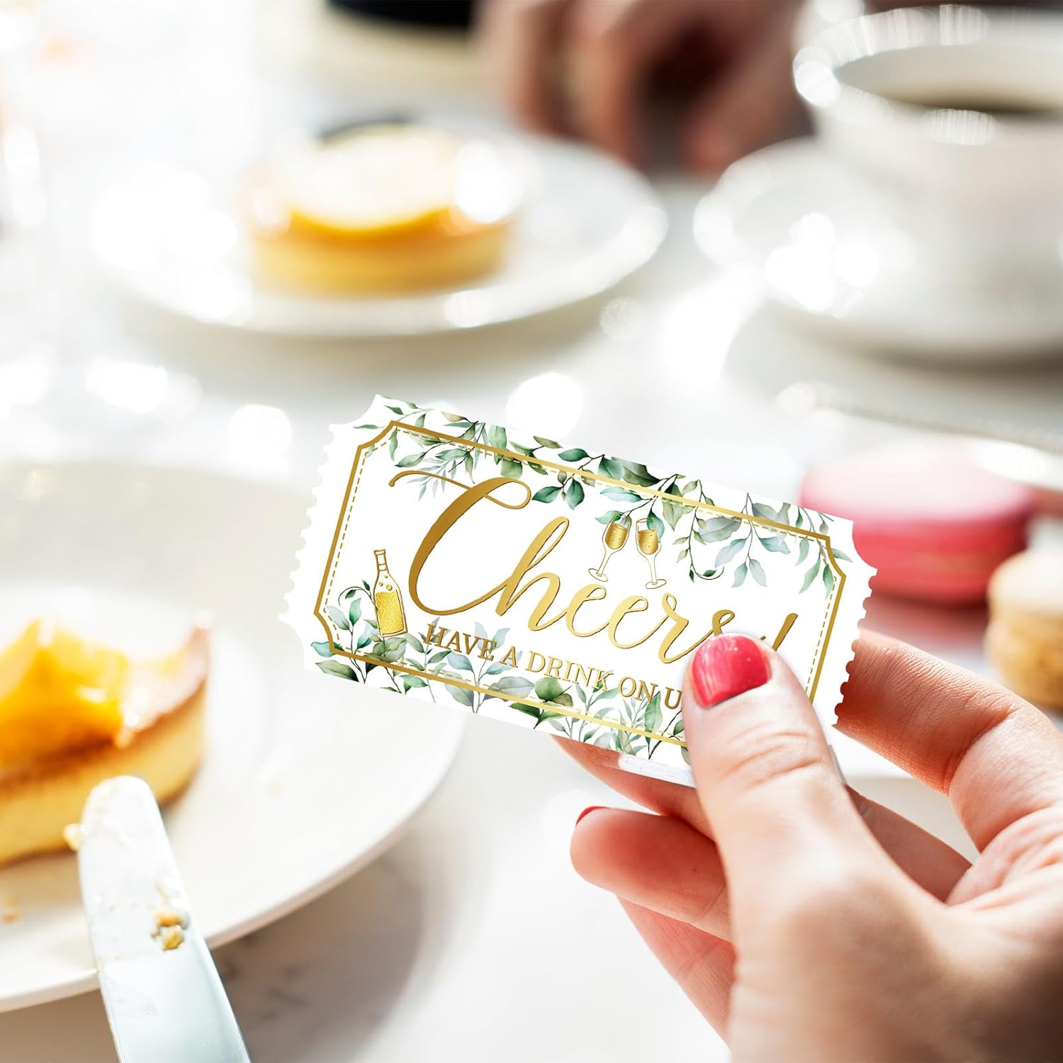 • Considerate design: Our drink tickets roll which feature cocktail glasses and the words "Cheers! HAVE A DRINK ON US”. Add greenery eucalyptus leaves and cocktail patterns as embellishments, the design is clear, the pattern is lovely, can bring an active atmosphere to your events.