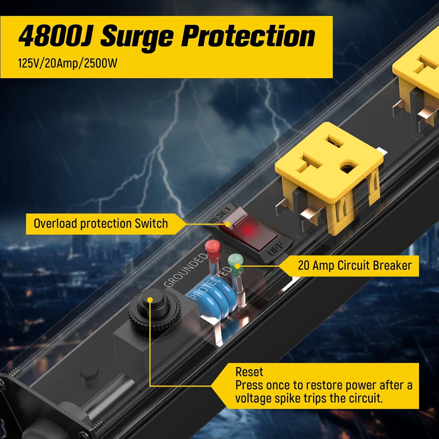 - Garage power strip Output rating - 125V/20Amp/2500W. The shop power strip come an ON/OFF switch. Built-in 20A circuit breaker, With 15 gauge 5-15P extension cord, power strips with 4800J surge protection, 5-15R/5-20R T-Slot adapter for more appliance