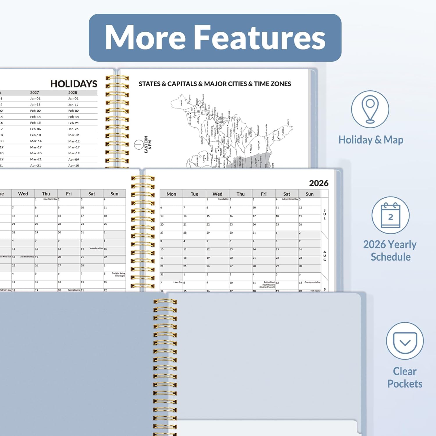 • Additional Features - The weekly planner includes 2026-2028 calendars, year schedule for full year 2026, holiday lists, contact pages, notes pages, important dates, and US time zone map. Rainbow monthly tabs simplify navigation and add a stylish, playful element to the planner's aesthetic.