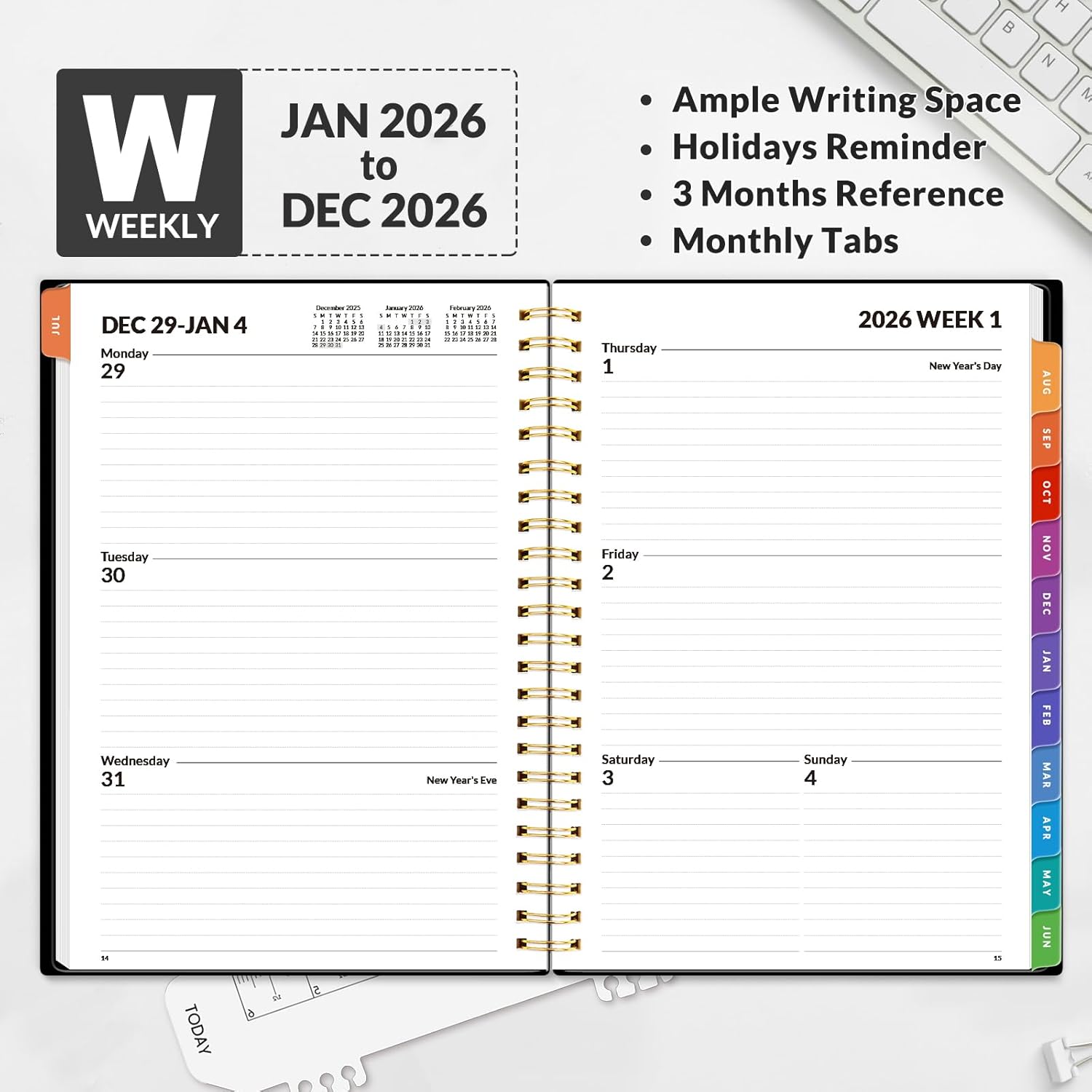 • Weekly View - 2-page weekly spread from Monday to Sunday provides generous lined writing space along with popular holidays and 3-month reference previews, allowing for easy appointment, note, and daily task management.