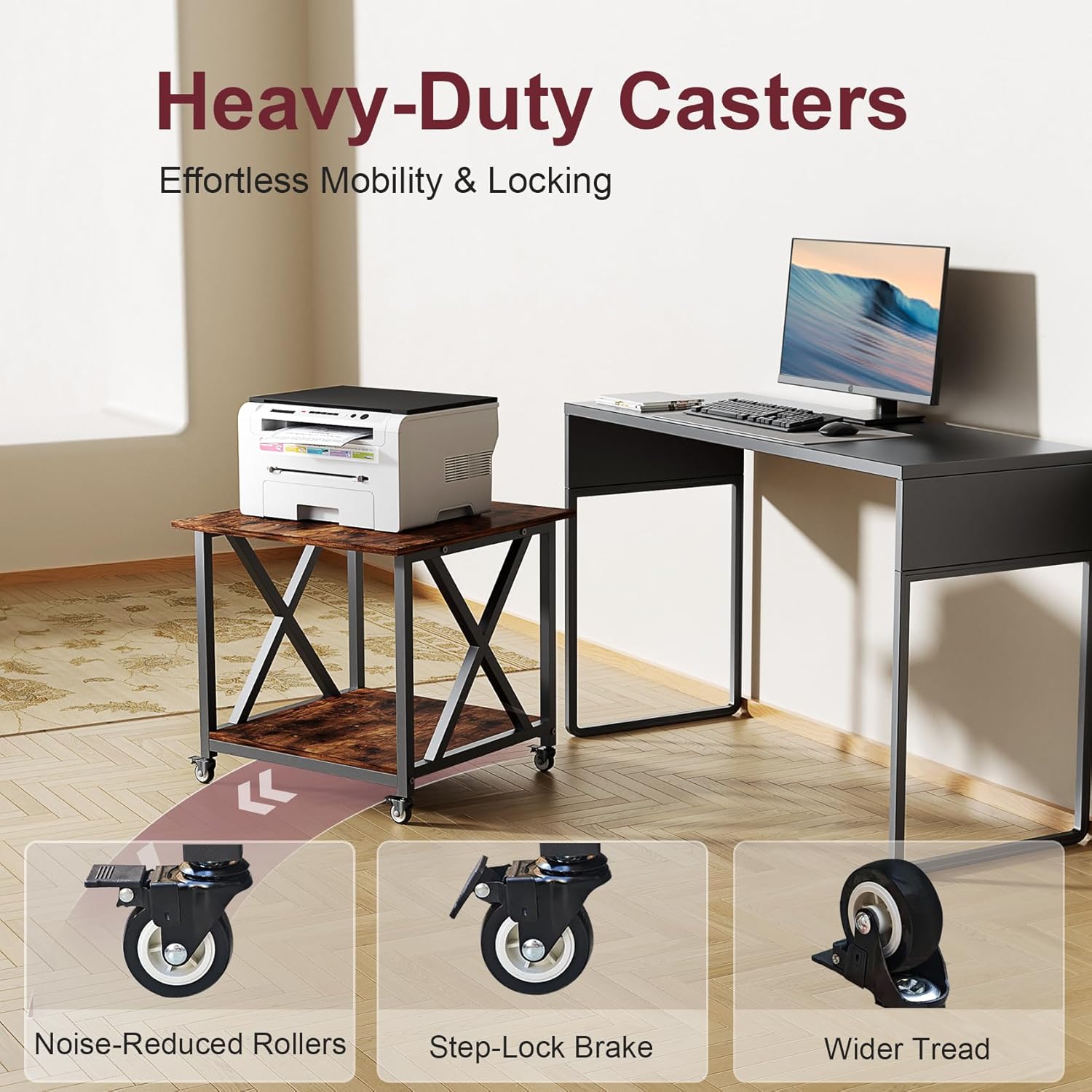 2-Tier Large Printer Stand with Storage Shelf, 23.6 x 23.6 Inches Printer Table, 2-Tier Rolling Cart with Industrial Wheels for Home Office, Mini Fridge, Laser, 3D Printer (Rustic Brown)