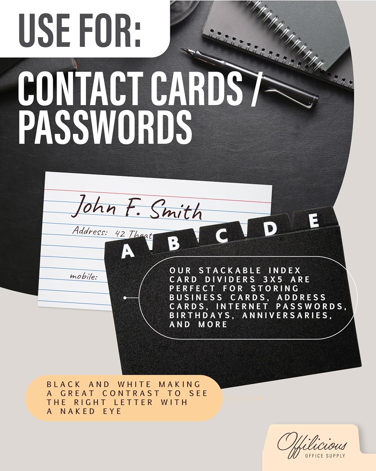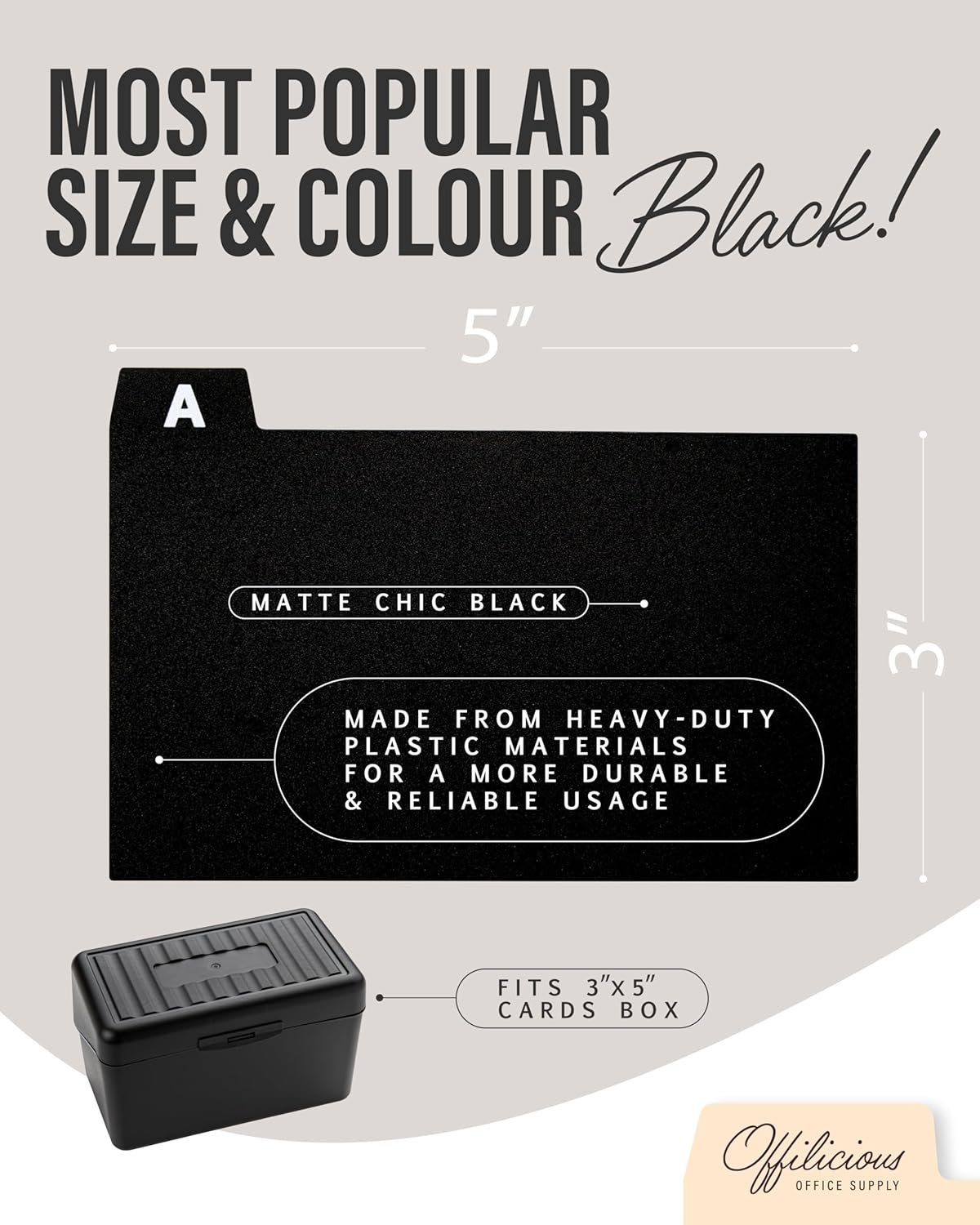 - BLACK BUSINESS CARD BOX A-Z DIVIDERS FOR QUICK SORTING: Includes 25 sturdy plastic alphabet dividers to help you easily organize your index card file box contacts, recipes, or study materials.