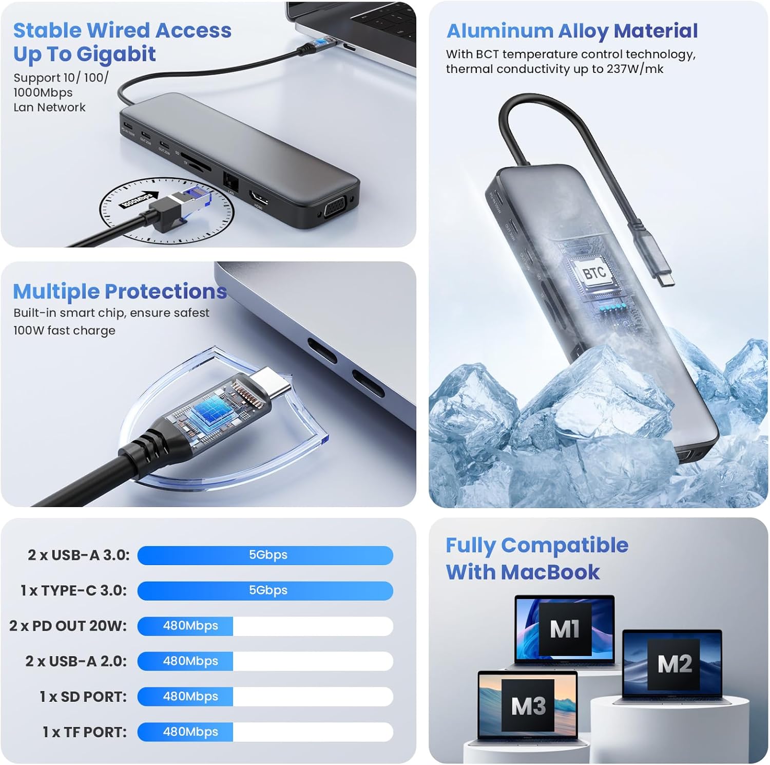 USB C Hub Laptop Docking Station Dual Monitor,14 in 1 Multiport Adapter with 4K HDMI,VGA,8 USB C/A Ports,100W PD Fast Charging,Audio&Mic,SD&TF,USBC Dongle for MacBook/Dell/HP/Lenovo ThinkPad/Surface