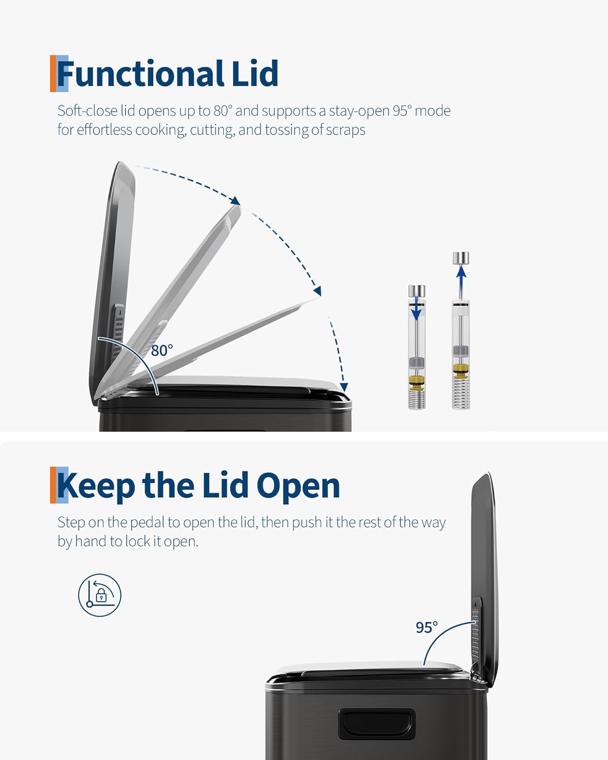 - [PRACTICAL DESIGN] – GarveeHome’s dual trash and recycling bins put ease of use first. Ergonomic side handles let you lift and relocate the entire unit effortlessly. The soft-close lid opens to 80° without collision with standard kitchen island edges, and locks at 95° for hands-free cooking prep and scrap disposal. Dual inner buckets with weighted-edge lids trap odors separately. A custom liner ring secures any standard bag snugly, eliminating slips, bunching, and overhang