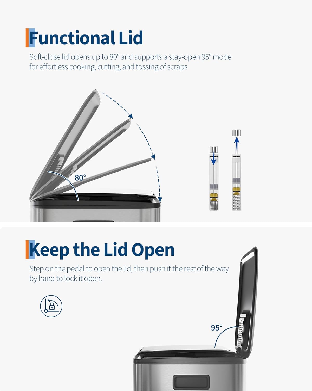 - [HIGH-QUALITY MATERIALS] – GarveeHome stainless steel trash can with lid is engineered for longevity. Its 410-grade ferritic stainless-steel shell delivers rustproof strength, scratch resistance and lasting luster. Two polypropylene inner buckets repel stains, odors and moisture. A thick ABS lid with stainless overlay resists dents; the industrial steel pedal endures 150,000+ steps and the one-piece ABS hinge survives over 300,000 open/close cycles