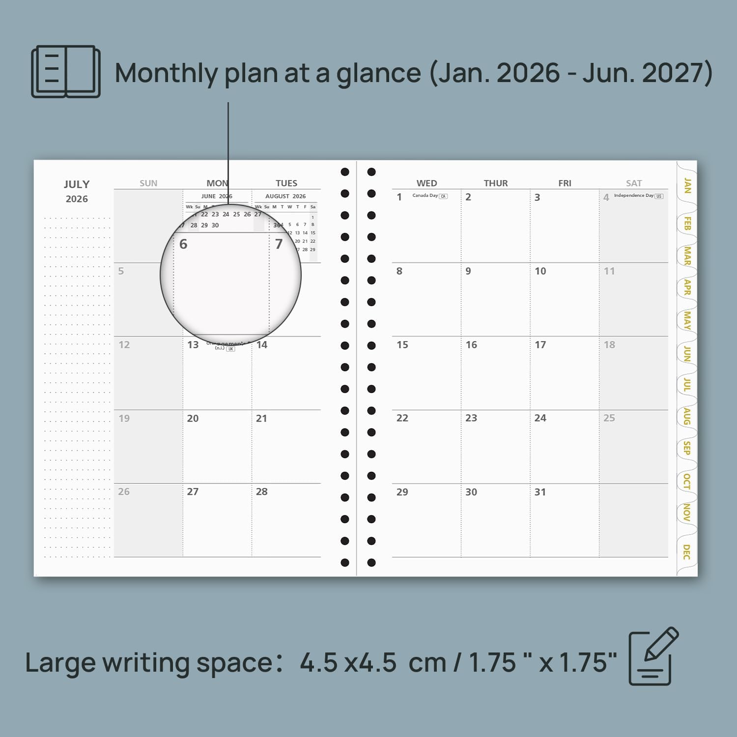 - 2 PAGES PER MONTH: This 18-month planner (Jan.2026 - Jun.2027) presents a spacious and unique calendar-like design, each month has a 2-Page spread with dotted notes and to help you manage deadlines and goals effectively.