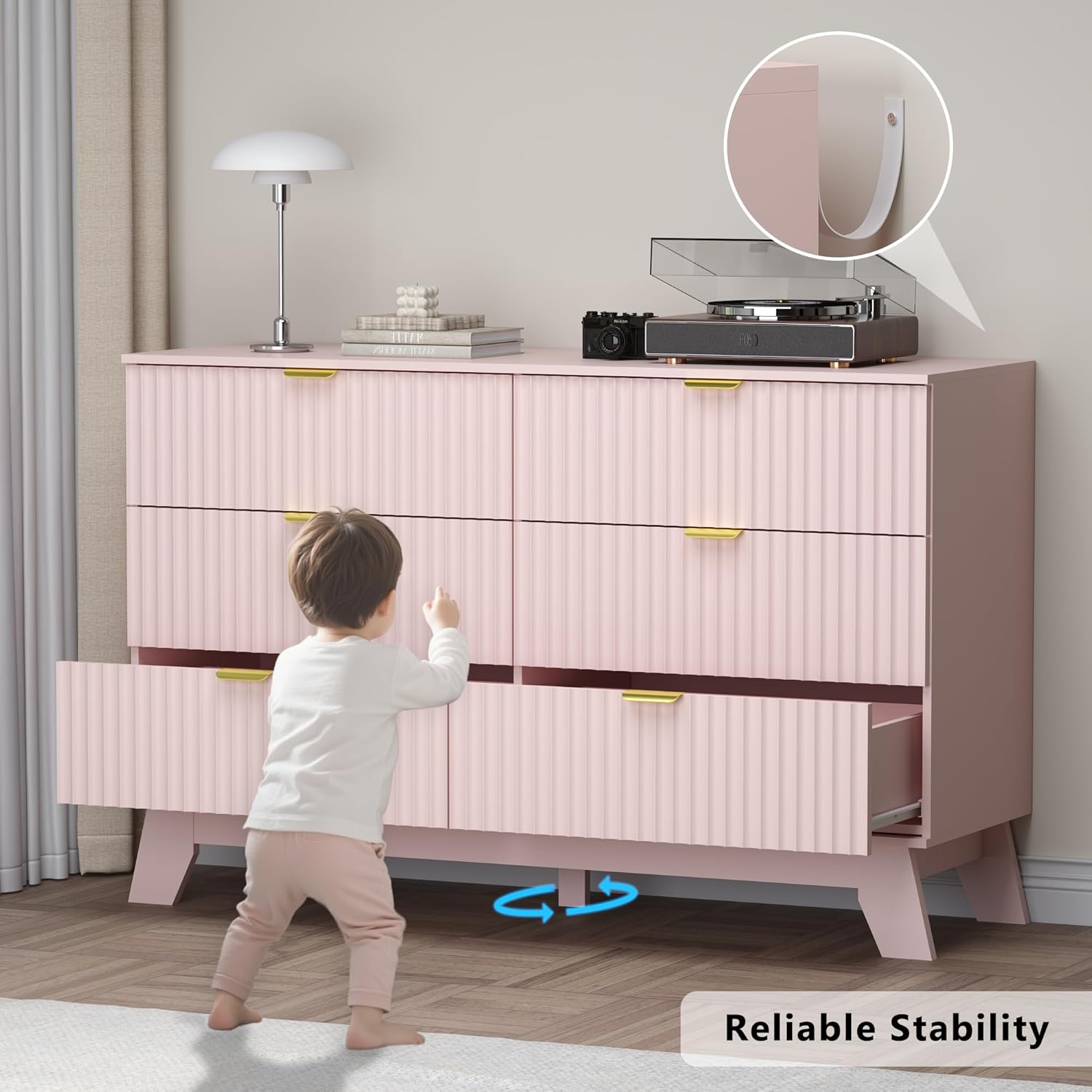 Fluted 6 Drawer Dresser, 47.2" Wide Modern Boho Chest of Drawers, Wooden Storage Dresser TV Stand for Bedroom, Living Room, Closet, Hallway, Curved Profile Design