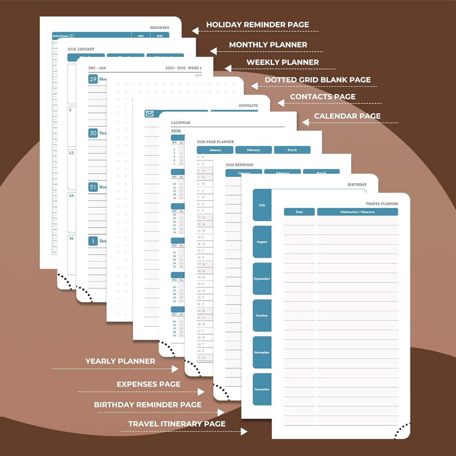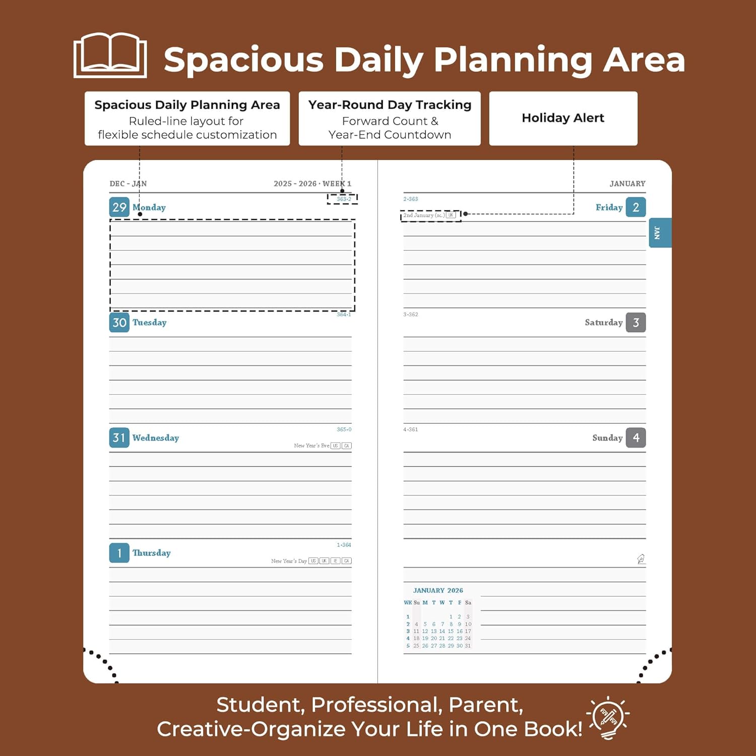 • Professional Grade Material for Your Daily Planner: Crafted with FSC 100GSM thick paper, this 2026 planner ensures good writing with markers while gentle on your eyes through its ivory white pages. The leather soft cover and lay flat binding make it a calendar planner companion for busy professionals, students, and families