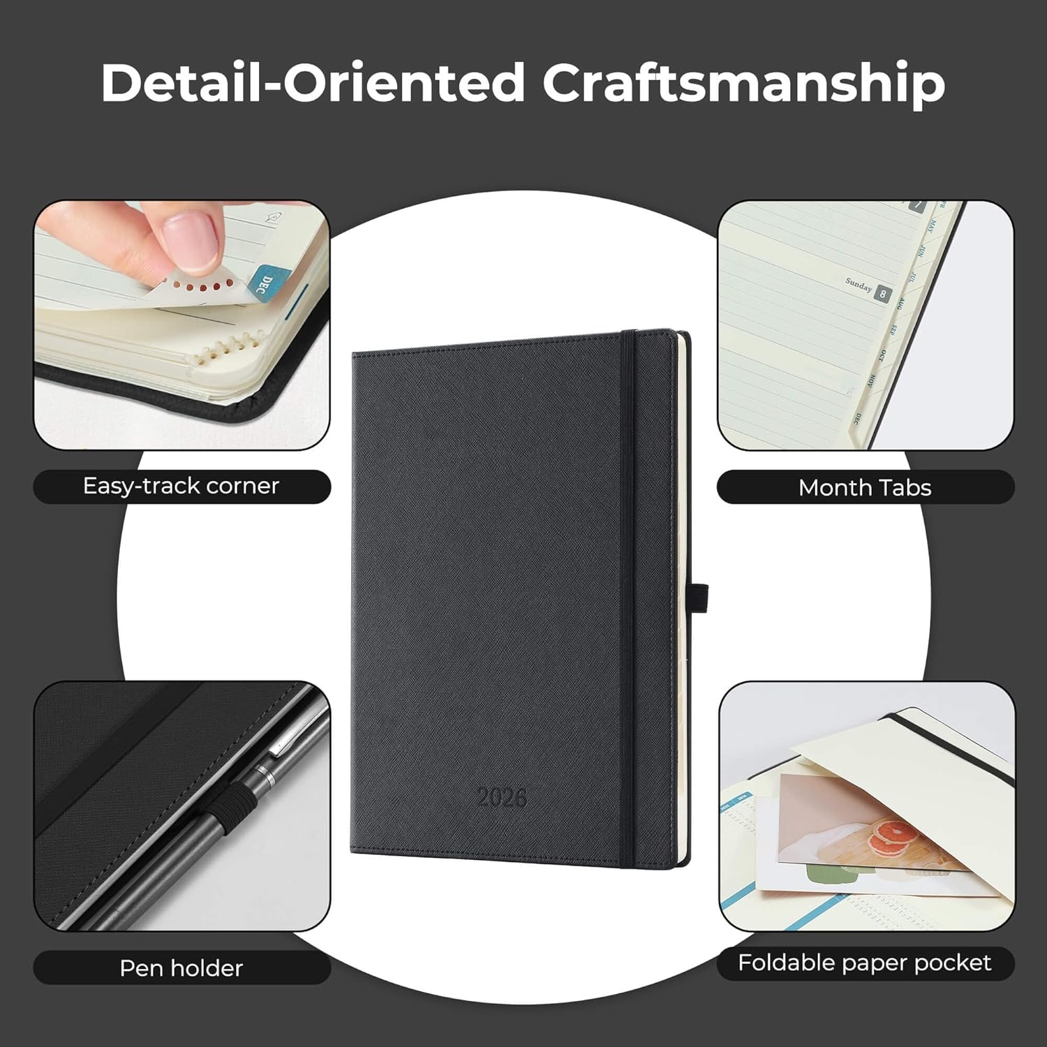• Professional Grade Material for Your Daily Planner: Crafted with FSC 100GSM thick paper, this 2026 planner ensures good writing with markers while gentle on your eyes through its ivory white pages. The leather soft cover and lay flat binding make it a calendar planner companion for busy professionals, students, and families